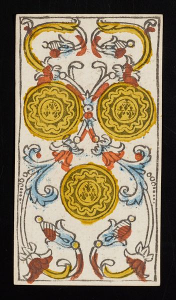 This is the 'Four of Cups' playing card, made by Claude Burdel in the 1700s, using woodcut and stencil with hand coloring. The process is clear to see: first, a design was carved into a woodblock, and printed to lay down the image. Then, color was added through stencils – simple masks laid over the print, allowing pigment to be brushed on only in certain areas. Look closely, and you can see how the orange, yellow and blue don’t quite line up with the black outlines. The result isn’t refined, but this was never the point. Playing cards like this were made cheaply, for a mass audience. The charm of this card lies in its directness. Burdel embraced the graphic quality of the woodcut. It’s a great reminder that techniques often associated with ‘craft’ have always played a central role in popular culture, creating a shared visual language.
