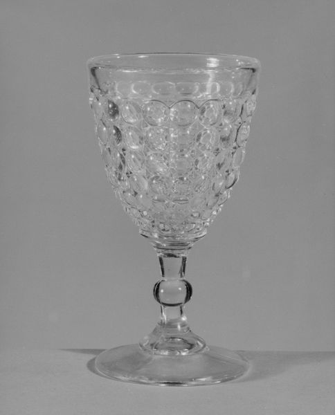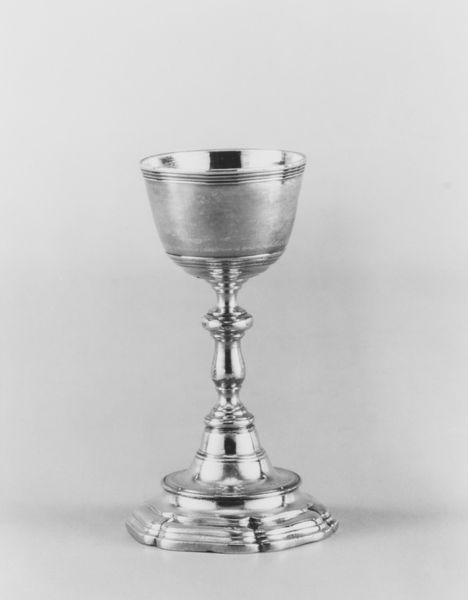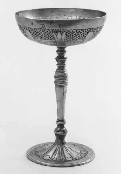 Editor: This silver wine cup, crafted sometime around 1619 or 1620, feels so incredibly delicate for a metal object! It's Baroque, but not as ornamented as I expect that style to be. What's your read on this piece? Curator: The cup is indeed an interesting study in form. Note how the artist uses a fairly limited range of motifs - mainly botanical - and relies heavily on the material properties of silver to achieve its aesthetic effect. How do you perceive the articulation of space in this work? Editor: The stem's segments create an interesting vertical rhythm that my eye wants to follow. The bowl, however, feels more static; it doesn't invite my gaze upwards in the same way. It feels contained, somehow. Curator: Precisely. Observe the textures; the hammered effect of the bowl contrasts sharply with the smooth, almost polished stem and foot. One might consider how this dichotomy shapes our understanding of the vessel’s function and its symbolism. Does it successfully balance surface decoration with overall structure, in your view? Editor: I'd argue that the relatively sparse decoration actually emphasizes the structure. The engraved flowers on the base complement the bowl's band, which prevents either from overwhelming the vertical elements. Curator: An insightful observation. Focusing on intrinsic qualities, we see an exploration of material, texture, and balanced compositional elements creating a harmonious, visually pleasing form. Editor: That's helpful; now I better understand how these restrained decorative choices actually contribute to the cup's overall aesthetic strength. Curator: Indeed. Hopefully, you will carry the idea of decoding art with structure, color, and form throughout your curatorial endeavors.