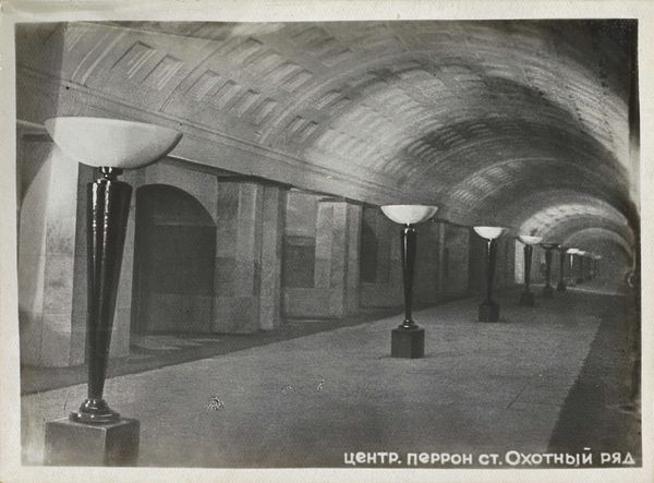 Editor: This photograph, "Interieur van metrostation Kominternstraat," dating from about 1930 to 1935, depicts a rather imposing subway station. The lines are very geometric, almost austere. What stories do you think this space holds? Curator: Indeed. Beyond the visual geometry, this image is thick with symbolism. Think about the period – early Soviet Union. Subways weren’t just transport; they were palaces for the people, potent symbols of progress and collectivism. Notice the light. What does that signify? Editor: Illumination... knowledge perhaps? Or maybe the utopian ideal? Curator: Precisely! The artificial light, repeated, suggests manufactured progress and illumination brought to the masses. The columns? Editor: They seem so monumental, almost classical, yet simplified. Curator: That's the crux. These are not mere supports; they echo classical architecture, subtly connecting the Soviet project with the grand narratives of history while stripping them back for the "modern" age. There is the power of industry and innovation married to historical memory. And what about the figures? What do they mean to you? Editor: They seem dwarfed by the architecture, anonymous within the grand design. Almost like placeholders. Curator: Excellent observation. The photograph invites us to contemplate the individual's role within the collective – a theme resonant with Soviet ideology. Editor: I didn’t realize how much cultural weight a simple photograph of a subway could carry. It gives the idea of a Soviet vision being played out in real life. Curator: Exactly. It’s a window into a specific moment and ideology, captured through carefully constructed imagery. A reminder that art exists within—and comments on—a specific historical context.
