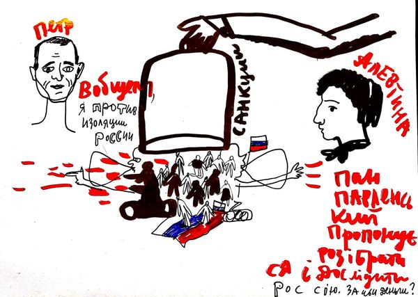Alevtyna Kakhidze made this drawing on paper in Kyiv. The black lines have a real immediacy, a kind of urgent, raw quality. You can feel the artist’s hand moving quickly, almost like a seismograph registering tremors of thought and feeling. The drawing has this incredible tension between text and image. The words are so direct, a call for peace and unarmed occupation, yet the figures and buildings are rendered with a kind of childlike simplicity. Look at the figure on the left, with ‘Western Philosophy’ scrawled on what look like wings – there's a touch of irony there, right? It is in simple contrast to the buildings on the right, daubed with red, looking as though they have suffered a disaster. Kakhidze is an Ukranian artist addressing really important issues, but doing it with a light touch, and not being afraid to incorporate text and cartoonish imagery. You can see echoes of artists like William Kentridge, in how she combines the personal and the political with such directness. Art can be a way of making complex feelings visible, and this drawing does that so powerfully.