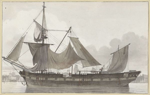 Curator: Here we have Gerrit Groenewegen's "Het ontladen van een driemaster," an engraving from 1789 currently held at the Rijksmuseum. Editor: It has a somewhat hazy quality, doesn’t it? Almost dreamlike. I'm immediately drawn to the intricacy of the rigging. Curator: That haze speaks to the process of engraving. Groenewegen meticulously carved fine lines into a metal plate, imbuing the print with that softness. The scale also speaks to the social and economic forces that drove Dutch maritime power. Editor: Indeed. But look how the lines coalesce to define form. The way the masts point toward the sky create such a satisfying visual rhythm in spite of their density. And note the interplay of light and shadow, especially across the hull. The tonal variations bring such depth and dimension to the entire scene. Curator: Exactly! Think about what this “discharge” actually meant: goods flooding in, fueling colonial trade, creating an ever-widening gap between those who profited and those who did the physical labor. This print provides a lens through which to consider labor practices and global commerce of the era. Editor: It's a depiction that belies its historical underpinnings through a deceptively calm and placid visual presentation. There is almost a feeling of rest, where light touches every peak and contour so gently. This visual quiet is what brings the viewer in. Curator: Precisely! Groenewegen masterfully balanced technical precision with social narrative, transforming what might be a mundane scene of unloading a ship into a tableau imbued with implications about the era. Editor: An interplay between form and context—beautifully wrought yet heavy with untold stories. Curator: Indeed, the visual beauty draws us into the circumstances of its creation, offering layers of history through careful engagement with the materiality of life and art.