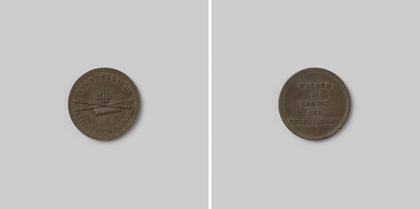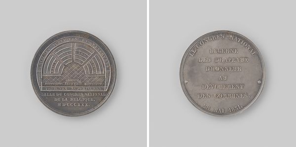 Curator: Editor: So, we have before us Laurent Joseph Hart’s silver medal, “Erkenning van de onafhankelijkeid van het koninkrijk België door de XXIV Artikelen van de conferentie van Londen,” created in 1831. It’s rather small, but I'm intrigued by the level of detail in the crown on the front. What do you make of this piece? Curator: For me, the real interest lies in the material and its production. Silver, as a precious metal, already signifies value and importance. Who commissioned it and for what specific purpose was it created? The medal's existence speaks to the burgeoning of Belgian national identity but, thinking materially, who were the mint workers involved, and what socio-economic class did they represent? Editor: That’s interesting. I was more focused on the design and its symbolism, but thinking about the process of its creation opens up so many questions about who made it and why. Curator: Precisely! Was it mass-produced or individually crafted? These are crucial considerations. Looking at the text inscribed on the reverse side—ministries, signatories—one might argue it was part of a larger political and economic machinery, manufactured to celebrate power and diplomatic achievements. How were these distributed? Were they for politicians and diplomats to wear? Were workers paid a good wage? The answers give this medal weight as something other than decorative art. Editor: So, shifting our focus from the finished product to its origins reveals its role in a much wider societal structure. Fascinating. Curator: Exactly. By examining its creation, materiality, and use, we can understand how objects like these are woven into complex systems of labor, value, and power. It’s not just a pretty historical object, is it? Editor: Definitely not, seeing it as a product of its socio-economic environment changes my perspective entirely. I’ll be looking at materials and labour much more carefully now!