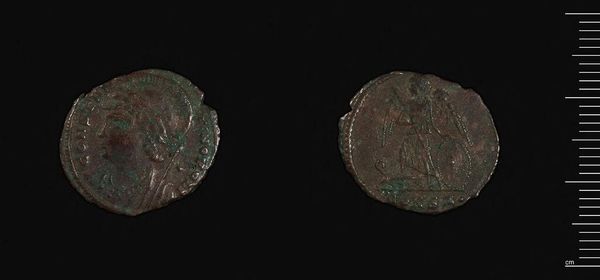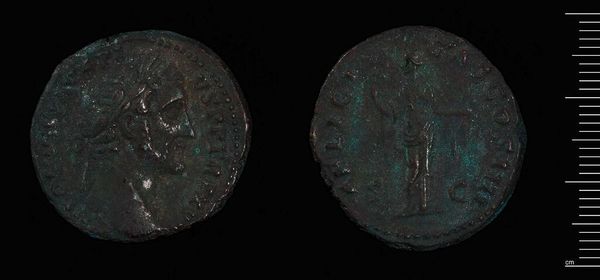 Curator: Look at this, the "Sestertius of Antoninus Pius," residing here at the Harvard Art Museums. Weighing in at about 20 grams, it's a tangible piece of ancient history. Editor: My first impression is one of weighty solemnity. The patina whispers tales of ages past, a quiet grandeur tempered by the inevitability of decay. Curator: Absolutely, the verdigris adds a layer of depth. Notice the portrait in profile, a deliberate study in power, contrasted by what appears to be some kind of goddess on the reverse. Editor: The goddess, or perhaps an allegorical figure representing Pax, embodies the era's aspirations of peace, yet the coin itself inherently speaks of commerce and the sinews of empire. Curator: Indeed, it makes me consider how the pursuit of peace and the realities of power are intertwined, even now. A tiny coin, yet a giant question mark, don't you think? Editor: Precisely. It leaves me contemplating the resonance of such a small object through the vast corridors of time.