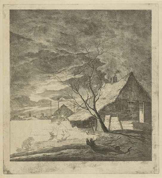 François Joseph Pfeiffer created this tiny landscape with farmhouses using etching techniques, sometime in the early 19th century. Observe how the composition is dominated by a limited palette, primarily shades of grey and black, which creates a somber, almost melancholic mood. The artwork's structure hinges on the interplay between the rough textures of the thatched roofs and the smooth reflections on the water's surface. Pfeiffer uses line and shadow to delineate form, giving shape to the simple rural architecture and natural elements. Notice the way the artist uses the semiotic system of light and dark to structure the visual field, creating depth and defining spatial relationships. The stark contrasts not only highlight the physical details but also emphasize the quiet, unadorned life of the countryside. Consider how Pfeiffer’s formal choices, such as his use of chiaroscuro and minimal detail, may be seen as a deliberate challenge to the aesthetic conventions of the time, inviting viewers to find beauty in simplicity and the everyday.