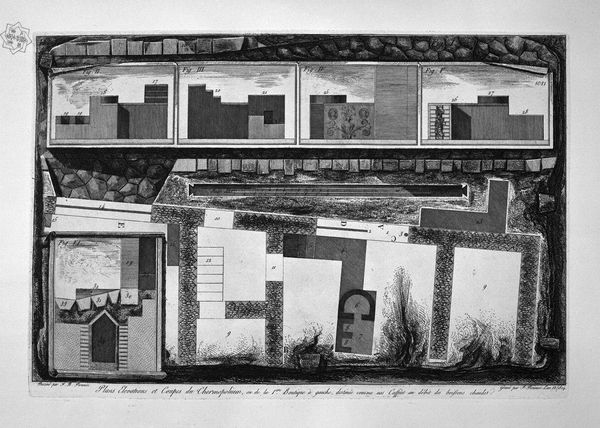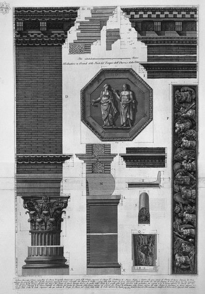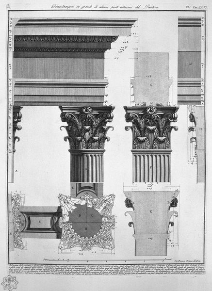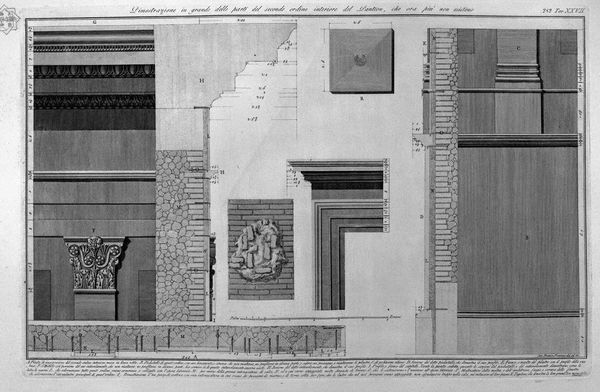 Editor: Here we have "Demonstration in Large Parts of the Interior of the Pantheon," an engraving by Giovanni Battista Piranesi. Looking at it, I’m struck by the almost scientific precision. It feels more like an architectural blueprint than a piece of art, really focusing on the details. What stands out to you in this work? Curator: Blueprints that yearn to be poems, perhaps? For me, Piranesi's rendering isn’t just documentation; it’s an evocation. It whispers of the grandeur of Rome, doesn’t it? I see a sort of romantic longing woven into those precise lines. He's dissecting the Pantheon, sure, but with a lover's gaze. Each segment becomes a sonnet, if you will, praising its form and historical significance. Have you ever felt that a place can almost… possess you with its story? Editor: That’s beautifully put! I see what you mean. It’s more than just cold, hard measurements. Now that you mention it, there's a real passion behind it. I guess I was too focused on the technical aspects. What would the intended audience at the time thought? Curator: Well, imagine being an 18th-century Grand Tourist. You’d perhaps purchase this engraving as a memento, a portable piece of Rome to carry back home, allowing yourself to become a kind of amateur scholar and architect, tracing Piranesi's lines to reconstruct the Pantheon in your own mind. What a delightful exercise for the imagination! Editor: It does put the travel souvenir in a new light! Almost like owning a miniature, intellectual theme park. Curator: Exactly! So, it’s not just about precision; it’s about access. It’s about inviting the viewer into a dialogue with a building, with history. Each measured line is also an invitation to dream. Editor: I definitely understand that it's an imaginative and intuitive approach to the Pantheon as more than just a study, which is great food for thought! Thanks so much for sharing, that's changed my view quite a bit. Curator: My pleasure. I am happy to assist. Remember, it is also not a static thing - our encounter with any work is a process to feel with a creative, critical eye, each time.