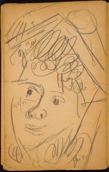 Editor: Here we have Max Beckmann's "Gesicht (Face)" a pencil drawing. The sketchiness and the upward tilt of the face almost feels like the subject is in despair, looking up for some kind of help or guidance. How do you interpret this work? Curator: I see Beckmann grappling with the societal trauma of his time. As an expressionist, he isn't simply recording a likeness but trying to capture an interior state. Consider the historical context: this was likely created between or after the World Wars, periods marked by immense loss and societal upheaval. Beckmann's involvement in World War I deeply impacted his artistic vision, causing him to question the existing social and political structures, and of humanity. What might the fragmented lines and distorted features suggest about his perspective on identity? Editor: So, you are suggesting that the incomplete features and the chaotic lines above the face symbolize that trauma, a shattered sense of self or society. Curator: Precisely. Expressionism as a movement often reflects feelings of alienation, anxiety, and a sense of moral crisis. Does understanding that shift how you perceive the upward gaze you mentioned? Is it solely despair, or is there a flicker of resistance, of defiance? Editor: I see it. Knowing more about the time, and his possible trauma, it's like a refusal to be broken completely, maybe? Instead of solely despair, I see resilience peeking through. Curator: I agree. By acknowledging historical wounds and individual resilience, this drawing encourages viewers to contemplate the impact of socio-political forces on individual lives. It creates an opening for broader, much-needed discussion on topics such as historical violence, personal survival, and how they reverberate through human history and impact cultural identity and personal being. Editor: That definitely gave me a new perspective. I saw only sadness before, but it seems there’s so much more woven into those lines. Curator: Absolutely, and by bringing in elements of history and social thought, our understanding grows richer and more meaningful.
