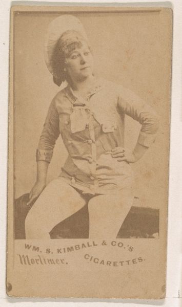 Curator: Looking at this, I immediately think of the way it softens time, giving it a slightly nostalgic feel. Editor: Indeed. This is Floy Crowell, and it comes from the "Actors and Actresses" series, specifically N45, Type 1, produced for Virginia Brights Cigarettes between 1885 and 1891 by Allen & Ginter. Curator: It is amazing what businesses will do to reach different target groups. Editor: Exactly! Think about how cigarette companies sought cultural relevance and boosted sales through these collectible cards, shaping public perceptions of performers like Crowell and fueling celebrity culture. The cards are themselves a carefully calibrated act of image production, intended to both promote cigarettes, and flatter, attract and immortalize Crowell and the other actresses and actors that populated the series. Curator: I’m interested in the mass-production aspect. These weren’t unique artworks, but rather items manufactured at scale, impacting labor practices and consumer culture profoundly. The choice of materials - card stock, the inks, and the printing techniques - each contributing to the accessibility and affordability that drove circulation. And you cannot miss how class enters the picture through mass-consumption culture! Editor: That is so true! The way such images circulated widely had implications. The circulation of such images allowed performances, and performers, to enter people's homes. The commodification of fame and the presentation of actresses as figures of aspiration reflect a broader shift in cultural values during the late 19th century. Museums began exhibiting photography seriously right around this period, too. Curator: Ultimately, whether you study it as a print, a photograph, or as an advertising medium, Floy Crowell’s image provides an extraordinary insight into material conditions and modes of production in its moment. Editor: Definitely. Viewing this as part of a historical record—of entertainment, of marketing, and of the era’s values—certainly gives me a deeper perspective.