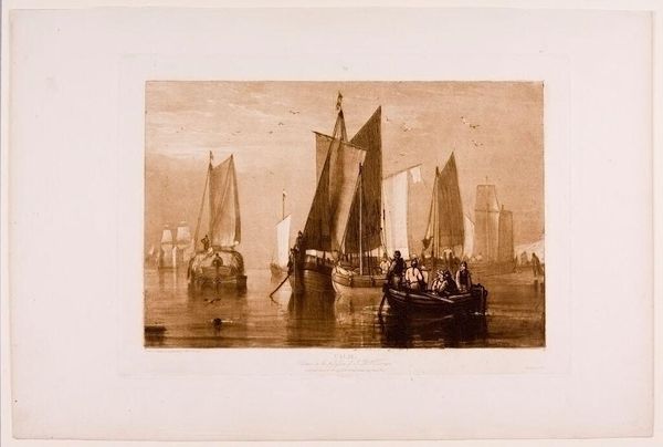 Curator: This is "Calm," an undated etching by Joseph Mallord William Turner, here at the Harvard Art Museums. The plate measures about 22 by 30 centimeters. Editor: It’s striking how Turner captures the stillness. The sepia tones evoke a sense of quietude, the boats almost suspended on the water. Curator: Turner made this etching after his own painting, as part of his "Liber Studiorum" series, intended to showcase different types of landscape and maritime scenes. Editor: The sails, though furled, still suggest a latent power, ready to be unleashed. The boats themselves become symbols of human navigation and our relationship to the sea. Curator: Absolutely. Turner was deeply interested in the sublime, in humanity’s place within the vastness of nature, and in creating a visual record for a broader public. Editor: I see it less as about power and more as about potential. There’s almost a melancholy here, a sense of waiting for something to happen. Curator: The art world needed patrons, after all, and the prints were intended to be collected and studied. Editor: Ultimately, Turner invites us to find our own meaning in the stillness, to connect with that universal human experience.