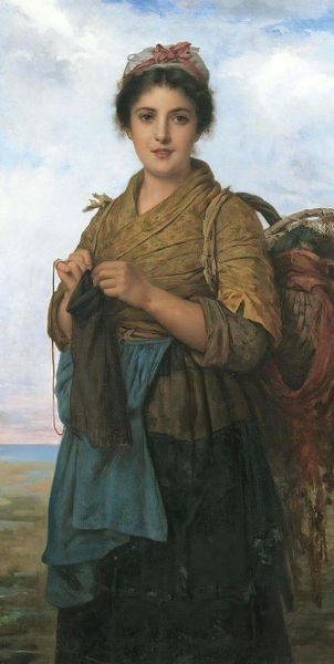 Editor: This is Dante Gabriel Rossetti’s "Salutation of Beatrice," an oil painting portraying a woman in a shimmering gold dress, set against a vaguely Italian cityscape. The mood is undeniably melancholic. What strikes you most about this piece? Curator: For me, it’s how Rossetti engages with the Pre-Raphaelite project of revisiting the medieval past, but also uses it to reflect contemporary anxieties about women's roles and idealised femininity. Notice how Beatrice's figure dominates, yet her gaze seems distant, almost trapped. Could it be argued she's a representation of the impossible expectations placed on women as idealized muses? Editor: That's a really interesting point! I was focused on the religious connotations, but the idea of "trapped" femininity really resonates. The angel figures in the background seem like bystanders, as if the female gaze transcends divine intervention, maybe even rejecting it? Curator: Exactly! And think about the symbolism of the roses and lilies. Traditionally associated with purity and love, here, their abundance almost feels suffocating, framing Beatrice within rigid boundaries. The narrative seems to subtly question these established codes, even as it appears to celebrate them. Do you think this questioning is intentional? Editor: It does. Rossetti seems to present the conventional symbolism then subtly undermines them, leading to uncertainty. I see this ambiguity of the established codes as an opening into complex narratives. Curator: Indeed. And considering Rossetti's own turbulent relationships, can we see "Salutation of Beatrice" as a self-aware commentary on the artist's own projections and idealizations onto women? Editor: I'm convinced. Thinking about Rossetti's personal life as a potential critique of the established canon offers such a deeper understanding of the painting. Curator: Precisely! The "Salutation of Beatrice" then becomes less a simple illustration of Dante’s poem and more a layered meditation on love, loss, and the burdens of idealized womanhood. Editor: This conversation really shifted my perspective. I went from seeing a romantic portrayal to recognizing the social critiques embedded in the image.