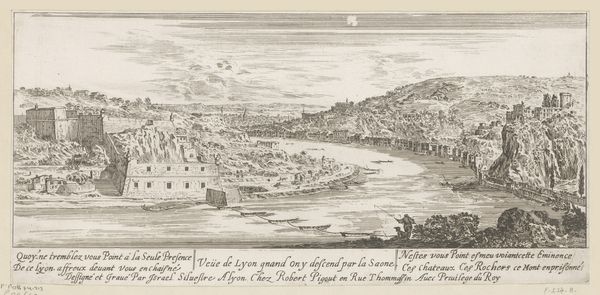 Curator: What an enchanting prospect! This artwork, held at the Rijksmuseum, presents a view of the Portuguese city of Coimbra. It's attributed to Pieter van den Berge and thought to have been created sometime between 1694 and 1737, using watercolor and coloured pencil. The baroque cityscape just unfolds before us, doesn't it? Editor: It does. I'm immediately struck by the light, almost airy quality. It's a brightly rendered scene, yet it also feels slightly melancholic. Is it the angle? That sharp drop behind the city? Curator: The slightly elevated viewpoint does impart a sense of observation, of distance. The walled fortifications wrapping around the crest of the hill speak to Coimbra's historical importance and its need for defense. They are also reminiscent of idealized cities from earlier eras. Editor: Right, like some kind of visual anchor to a more glorified past, with the promise of civilization amid turbulence. Notice how the bridge cuts through, a conduit from town to building – the singular way to join forces. Curator: Indeed. Bridges have held strong symbolism for centuries—connections, passages from one state to another. The cityscape motif itself holds such importance in the cultural understanding of our societies, representing order, civilization, and a control over nature, even if sometimes perceived from afar. The architectural density might hint at something unspoken, in a deeper layer. Editor: What do you mean, deeper? It seems to depict quite a bustling center. Look at the water traffic. Curator: But it's ordered bustle. Planned. Almost sterile. A testament of structure, which at times, serves as a reminder of social control. Perhaps that explains the tinge of melancholy that hangs over it for me. It makes you think of power, but in the control of something potentially vital. The hill versus the village; are these power dynamics visible even in van den Berge’s time? Editor: That’s an intriguing interpretation. From my viewpoint, there's a charming openness to it; perhaps the slight artifice enhances the appeal rather than diminishes it. This isn't realism—it’s an interpretation of the city and what the city embodies, as perceived at the time. A testament of order. Curator: Perhaps both aspects are essential parts of this composition. That interplay of controlled visual symbol versus potential commentary is truly compelling. Editor: A lot to contemplate; its beauty belies its social complexities!