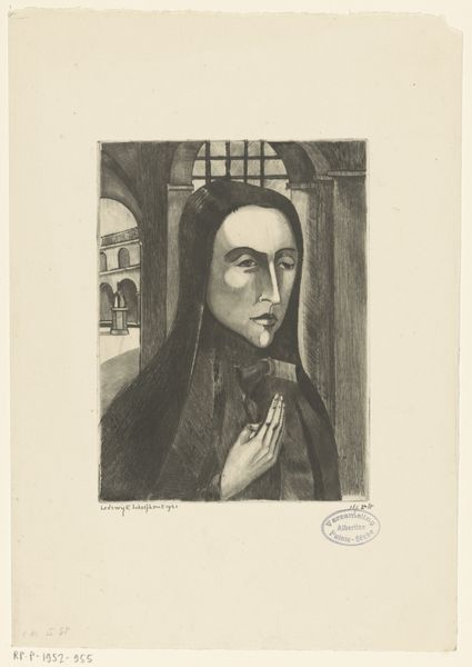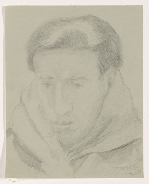 Curator: Here we have Lodewijk Schelfhout’s etching from 1921, titled “Pierrot III.” The print showcases the head and shoulders of a figure rendered in delicate, almost ghostly lines. What strikes you most when you first view it? Editor: The immediate impact is one of quiet contemplation. There's an air of vulnerability and melancholy about the closed eyes and subtly down-turned mouth. It feels introspective, like a soul searching for meaning. Curator: Interesting, because formally speaking, I find myself drawn to the use of line itself. Notice the stark contrast between the areas of dense hatching, which create volume and shadow, versus the flat expanses, particularly in the face and ruffled collar, which draw attention to flatness as a distinctly modernist concern. How does this technical approach reinforce the theme you’ve highlighted? Editor: It deepens it. Pierrot, traditionally a figure of sorrow and unrequited love, often played a trickster as well. The deliberate artistic choices you've mentioned heighten the sense of him as alienated. There's a rawness, particularly visible in the eyes rendered as simple dark bands, which hint at a more complex, even psychologically fraught narrative beyond just the sad clown trope. He represents artists after WWI; using such simplistic materials to explore very complicated feelings of grief and loss. Curator: Your perspective is illuminating, especially within a historical context. Looking again at the etched lines of the figure against the paper, what’s compelling is the relationship between figure and ground, and this interplay really activates the surface, drawing us into an aesthetic and sensory engagement independent of any clear social commentary. It functions as an elegant study in graphic economy. Editor: And for me, the elegance resides in its ability to speak volumes about a turbulent period, through the poignant image of an artist lost in thought, stripped bare, his conventional mask is removed. It becomes a portrait of artists using themselves as subjects. Curator: Thank you; this exercise of engaging with varied perspectives always enhances and deepens our appreciation of artwork. Editor: Absolutely, and ideally helps our audience question, as well as listen!