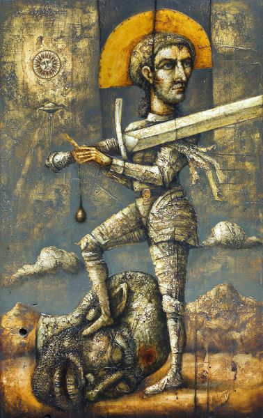 This mixed media piece, "Motanka", was made by Oleh Denysenko. Look at the layering and texture! The artist builds up this surface, almost like he's constructing something rather than just painting. You can really feel the hand of the artist here, can't you? It's not about hiding the process, but embracing it, making it part of the story. I keep coming back to the halo around the figure's head. It's not perfect, not a smooth circle, but more like a sun, radiating out in uneven bursts. And that cross on the face – is it a mask, a binding, or a kind of protection? It’s that tension between beauty and something a little unsettling, a little broken, that I find so compelling. Denysenko reminds me a bit of Antoni Tàpies, in the way he treats the surface as a field for exploration, a kind of archeological dig where the past is always present, peeking through the layers. Art, after all, is just a conversation between artists, a dialogue across time.