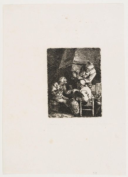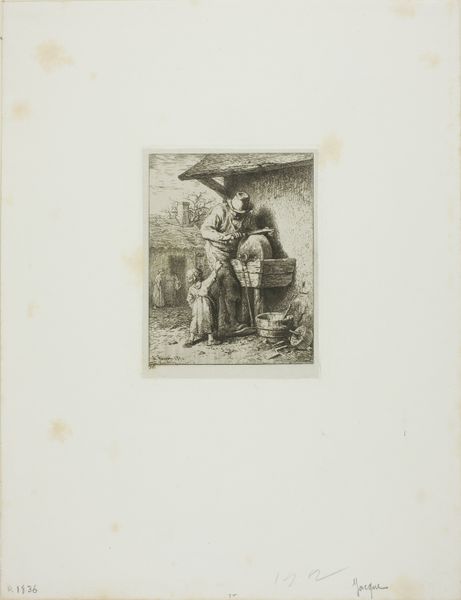 Curator: I’m instantly struck by how visceral this image is. It feels almost… primal. There's a roughness, a starkness. Editor: That’s a wonderful way to put it. We're looking at "The Pig-Butcher," an etching made on paper in 1844 by Charles Jacque. It belongs to the Art Institute of Chicago's collection and gives a fascinating glimpse into everyday life. Curator: An etching... of course. That explains the incredible detail within the confines of the small image. I mean, the way the light flickers across the pig carcass, the almost frenzied activity suggested by the lines... you can practically smell the blood. Morbid, I know! But so evocative. Editor: It's that contrast between the banality of the task – providing food – and the raw, unflinching depiction that grabs your attention. The scene is undeniably grim, and I wonder how its public context shaped how this imagery might have been received. Etchings at that time, 1844, were also becoming quite accessible and widely spread through illustrated newspapers and books, so what might this reveal? Curator: Accessible, yet challenging. Genre paintings were designed to depict everyday life and appeal to the masses, however some may find these elements troubling. Perhaps a deliberate decision by Jacque to show us, unfiltered, where our food comes from? Maybe a commentary on man's relationship with the natural world, painted not in broad strokes but scratched out and bled into the paper... in every detail? Editor: Exactly, consider that while Jacque wasn’t necessarily engaged in overt political commentary, depicting scenes like this forced a certain segment of society to confront aspects of existence they’d perhaps prefer to keep at arm's length. How many wealthy Parisian dining rooms were consciously aware of scenes like this allowing their feasts to be possible? Curator: It makes you wonder what conversations were sparked over brandy and cigars after encountering this print. It's beautiful and brutal and thought-provoking. Editor: Beautifully said! Jacque manages to raise so many important points with such simplicity. I, too, will keep that in my mind as I contemplate the image now.