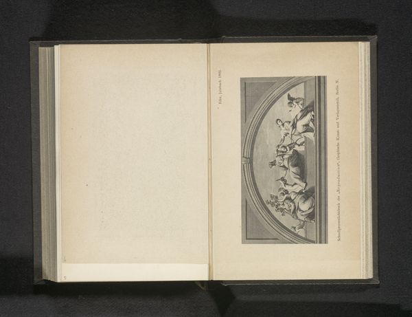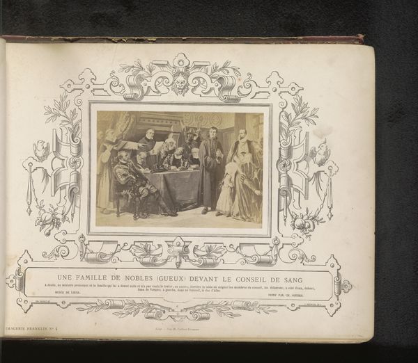 Curator: This print, "Reproductie van een prent van een gedecoreerd portret van Gérard de Lairesse," likely created before 1880, immediately strikes me as a commentary on artistic production itself. The elaborate framing and dedication text adjacent to the central image bring to my mind questions about commerciality of art and how value gets produced and represented. Editor: It’s certainly visually busy. What I find striking is how much space the frame occupies in relation to the central image, a smaller framed baroque scene with several figures. What do you see in this piece that interests you from a materialist perspective? Curator: As a reproduction of a portrait, likely for mass consumption, the labor and cost involved are central to understanding it. The paper, the ink, the engraving process itself...each aspect dictated by economic considerations of the time. We see "high art," but channeled through processes and made affordable through mechanical means, for whom I wonder? Editor: That’s a good point. Was printmaking considered "lesser" than painting during this era, even though it democratized art access? How does that tension impact the viewing of this reproduction? Curator: Exactly. Was this print meant to elevate Lairesse, or to commodify him? Think about the distribution networks: How did these prints circulate? Were they luxury items, or intended for a broader audience of aspiring artists and craftspeople? What does this signify in a broader context of production during the era in which it was produced? Editor: I hadn't considered the question of artistic labor and how value is constructed around reproductions like this. It's a complex dance between accessibility and artistic status. Curator: Precisely. It forces us to move past aesthetics and into questions of production, consumption, and the social life of art.