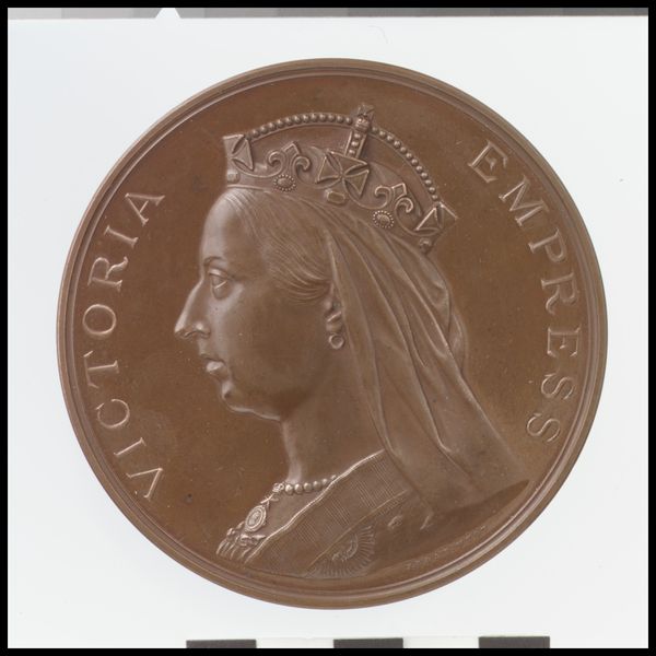Editor: Here we have the Victoria "Gothic" Crown, created by William Wyon in 1847. It’s a striking metal relief, a coin actually, depicting Queen Victoria in profile. There's a real sense of formality here. What are your initial thoughts, looking at this piece? Curator: My eyes are immediately drawn to the overt symbolism. Beyond the crown, obviously representing royalty and power, note the “Gothic” style it evokes. The "Gothic" inscription intertwines faith and temporal authority. Wyon, in selecting this imagery, intentionally links Victoria to a lineage of strong, divinely sanctioned rulers, drawing from collective historical memory. Do you see the lettering bordering her profile? Editor: Yes, the lettering surrounding the portrait. It seems intentionally elaborate. Curator: Precisely! Notice how the lettering mimics illuminated manuscripts. This stylistic choice acts as a visual shorthand, instantly communicating ideas of tradition, authority, and even divine right. How does that visual vocabulary resonate with you? What feeling does it evoke? Editor: It makes it seem almost… theatrical, like she's playing a role within this grand historical narrative. Curator: An excellent point. It wasn’t merely about recording her image; it was about crafting a carefully constructed symbol for an empire and a figure who stood as a powerful matriarch. What do you make of that potent use of visual language? Editor: I see how the artist imbued a simple portrait with so much loaded meaning; I will remember this for my final essay on visual semiotics! Curator: Indeed! Wyon's craft encapsulates the potency of symbols. Looking closely reminds us that visual rhetoric shapes and reinforces collective beliefs, leaving indelible imprints across generations.