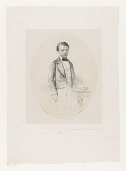 Curator: Here we see a lithograph drawing created sometime between 1843 and 1845 by Paulus Lauters titled, "Portret van Adi Patti Mandura." It is currently housed at the Rijksmuseum. Editor: My immediate impression is one of subdued authority; the neutral palette and somewhat severe expression convey a sense of formality. Curator: Indeed. Considering the printmaking process involved in lithography during this period is crucial. The artist had to meticulously transfer the image onto a stone or metal plate, making this image potentially widely distributed. This inherently alters our perception when comparing it with a unique portrait. Editor: Precisely. This hints at the subject's status but also raises questions of accessibility and circulation within colonial power structures of the time. Adi Patti Mandura—how does his Javanese identity intersect with this formal Western style of portraiture? Curator: His traditional Javanese headdress offers a distinct visual marker amidst the European clothing and style of the portrait. We should look closely at the materiality and labor required to produce and reproduce these lithographs, the implications for distribution networks of imagery across colonial contexts, and the labor needed for printmaking during this era. Editor: This blending certainly provokes a deeper reflection on identity and representation under colonial rule. What narratives might this image have perpetuated, and for whom? Curator: By dissecting the mechanics of this artistic production—the precise methods and intended recipients—we can better assess the impact this kind of image might have had on circulating and standardizing cultural power. Editor: Absolutely, this helps to emphasize that even portraits seemingly intended for commemoration were active agents in social processes, reflecting, reinforcing, or even subtly challenging prevailing social power balances of colonial Dutch society. Curator: Investigating the social conditions surrounding artistic production always sheds invaluable insight to pieces that, on their own, might seem merely formal likenesses. Editor: For me, the image offers a rich starting point to consider identity, colonialism, and cultural negotiation. It goes beyond a simple likeness; it becomes an embodiment of intersectional experiences.