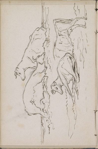Curator: Here we have Johannes Tavenraat's pen and ink drawing on paper, "Deer by a Tree," created between 1862 and 1864. Editor: My immediate impression is one of vulnerability, a captured moment almost like looking at the deer as if through a hunter's scope. There’s a sketchiness that doesn't hide anything, offering rawness. Curator: That resonates with how Tavenraat’s realism approaches the subject matter. Deer often carry strong symbolic weight, signifying innocence, gentleness, or the wild. By drawing them here, near what seems like the edges of a forest, the picture sets up that opposition between nature and human development or control. Editor: It also hints at the romanticism intertwined with realism, the longing for nature which, especially when this work was produced, had a very male, colonial association with possession. The deer appear, in a way, to almost be arranged on display under the sparse shelter of the tree's "roof". It raises difficult questions about our relationship with the natural world, doesn't it? Curator: I agree, and look at the marks made with the pen – the quick, nervous lines contrasting with darker pools of ink for shadow, and a sense of immediacy, almost like capturing a fleeting glimpse before it's gone, the lines creating emotional context too, that resonate between beauty and discomfort. Editor: Considering that during this era, access to nature wasn't democratized but dependent on social hierarchy, I question for whom Tavenraat painted this scene. Who gets to be nostalgic for an idea of untouched wilderness when the concept itself is tangled up in historical power dynamics? And that informs what viewers saw then, and even what we might see now. Curator: That adds new layers to the drawing; it asks to go further than a pleasing landscape—maybe it encourages questioning of what we define as “nature” itself, and of how representation inevitably entangles even the most ‘innocent’ of subjects. Editor: Precisely! It encourages me to consider the implications behind the aesthetics, behind what otherwise might appear a pastoral, tranquil scene. The work invites this dialogue between art and lived experience. Curator: For me too, that sense of capturing cultural memory is amplified – how symbols of nature retain significance across decades, provoking continuous re-evaluation. Editor: Absolutely. We carry inherited narratives. Art offers a vital chance to critically question and dismantle them.