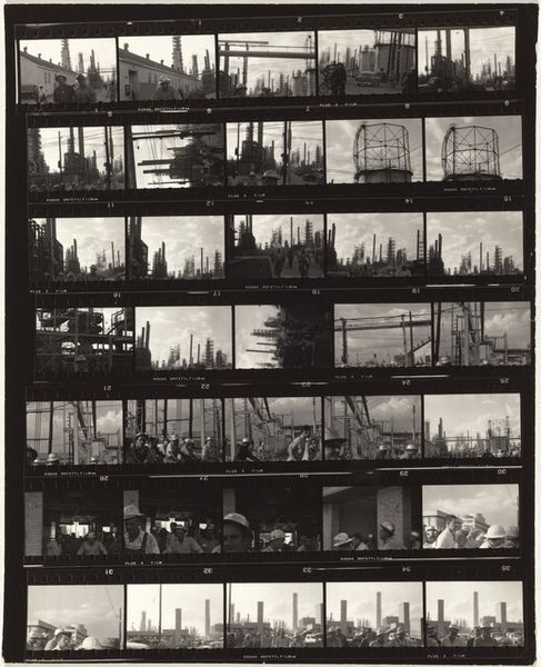 Curator: This photograph, titled "Gas Tanks," was taken in 1992 by Bernd and Hilla Becher. Their project reflects conceptual and New Objectivity concerns. What’s your initial impression? Editor: My first reaction is awe and a sense of detachment. Fifteen hulking gas tanks in serial form – a monotonous yet somehow beautiful testimony to industrial function. You feel how raw the process must have been in building them. Curator: Precisely. The Bechers are renowned for documenting industrial structures with an almost clinical objectivity. They approached their work as an endeavor in photographic typology, systematically cataloging these buildings to study variations in design and form across time and location. Editor: The materials become intensely present. Look at the varied textures on the metal skins; the rivets, the rust, the wear—the way the light catches the curved surfaces, revealing their materiality. Curator: Absolutely. Consider these tanks not just as isolated objects, but as cultural symbols. These gas tanks remind me of archaic, classical forms, like Greek temples dedicated to industry, with a kind of visual rhyme, like a solemn architectural score. They stand as testaments to societal progress, while also being a forewarning, loaded with allusions to consumption and environment impact. Editor: I’d suggest there's another narrative at work. The labor is made clear in the very subject. We see the product, not the act. The uniformity obscures the stories and realities of industrialization; labor becomes abstract. Curator: A sobering perspective. But to their credit, the Bechers pushed against artistic conventions. They are not merely capturing the external reality of the tanks, but also revealing deeper truths regarding industrial evolution and function. Editor: A powerful study on material conditions shaping how we consume, build, and, importantly, remember the age of mechanical reproduction. Thank you for this dive, it made me want to examine closer!