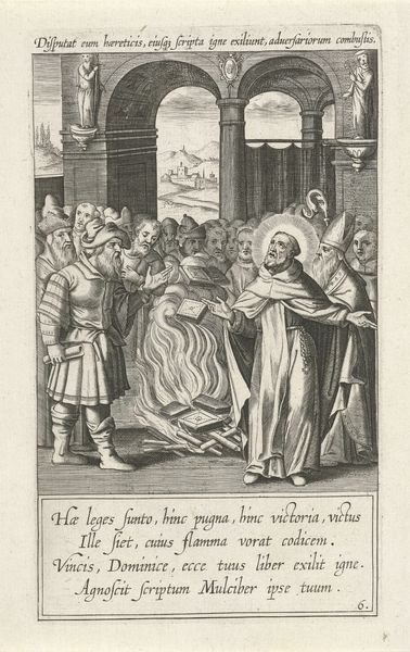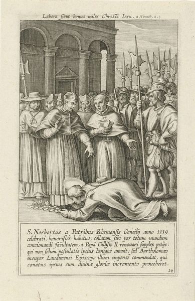 Egbert Van Panderen created this print, "Thomas van Aquino joins the Dominican Order," in the early 17th century, using engraving. The composition is structured around a central kneeling figure, set against the backdrop of standing figures and architectural details. The artist uses line and shading to create depth and texture. The act of joining the Dominican Order is rendered through formalized gestures and spatial arrangement. Consider the semiotics of this image: the kneeling figure symbolizes humility and submission, while the surrounding figures, presumably members of the order, represent authority and acceptance. This visual encoding is a cultural shorthand to convey the values and power dynamics within religious institutions. Note the contrast between the detailed foreground and the more sparsely rendered background. This functions as a way to focus our attention on the central event, while also suggesting the broader context of religious life. This print is not just an aesthetic object; it is a cultural document that participates in the construction and reinforcement of social norms and religious ideologies.