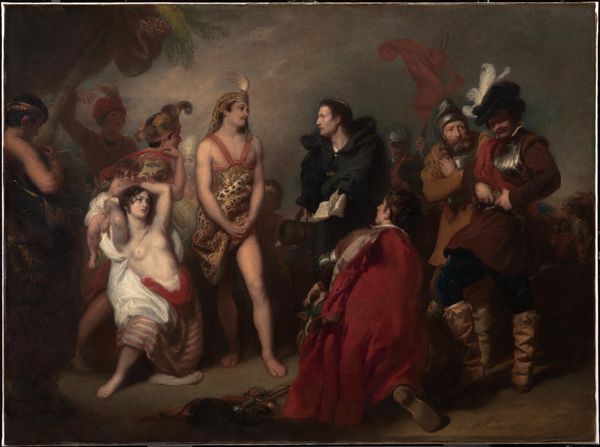 Curator: Here we have Eugène Delacroix's "The Stage Of Archduchess Isabella", an oil painting that presents a historical tableau, seemingly caught in mid-action. What strikes you first about this piece? Editor: Immediately, the brushwork—it's incredibly loose, almost feverish. And the tonality is warm, creating an atmosphere of heightened drama, despite the seemingly small scale of the piece. Curator: It’s believed this is likely a study or preparatory work. Considering the history that Romanticism engages with, could you reflect on how power dynamics may have been translated by Delacroix, and for whom? Editor: Note how Delacroix's handling of light and shadow defines form, creating both volume and dynamism. It’s almost sculptural in places, especially the rendering of the figures in the foreground, but again the loose strokes are also striking in that even with minimal details he portrays the emotions and energy of the composition with incredible efficiency. Curator: Absolutely, and when you factor in Delacroix’s historical context, we start to realize he may be portraying historical or mythical narratives to evoke a spirit of French nationalism after the fall of Napoleon and during a time when France needed heroes. This painting offers a visual metaphor, suggesting possible themes of power and social performance, very relevant to France’s own changing role within Europe at the time. Editor: I can’t help but focus on that tension between classical form and the Romantic painterly style. Look at the brushstrokes on the Archduchess's face! Such gestural marks simultaneously build form and break it down. This tension activates the entire surface of the painting. It pulsates. Curator: These brushstrokes add depth to the narrative and bring life to Isabella and her audience, reminding us that historical depictions always tell stories beyond those initially intended. They mirror the social tensions and aspirations of Delacroix's own era. Editor: Looking at the formal arrangement, I am really caught up in the artist's masterful deployment of underpainting in these light effects; the bare canvas is essential for luminosity in what otherwise would become heavy and opaque due to oil layering. Curator: Delacroix gives us more than a snapshot of a stage; he presents a complex lens through which to view historical pageantry and French society, perhaps even questioning it. Editor: Indeed. This painting rewards deep visual engagement, uncovering the subtle intricacies within its energetic and textured surface, an exemplar of movement that gives it a very modern feel.
