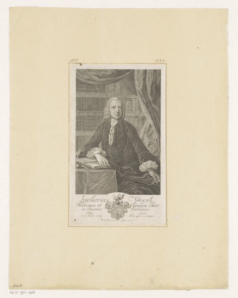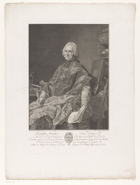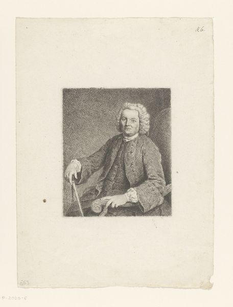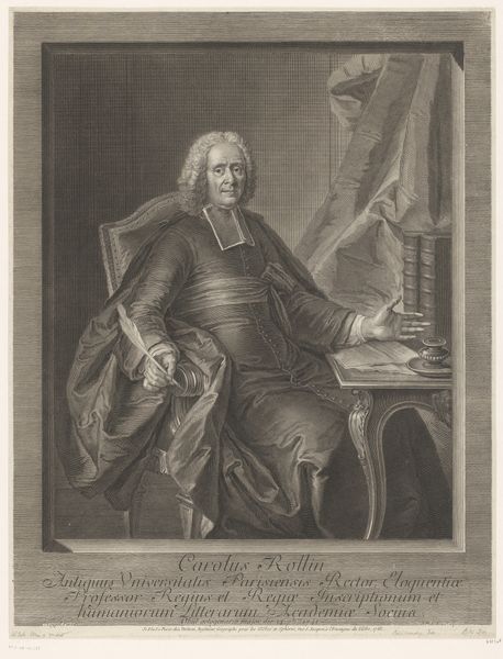 Editor: Here we have Giovanni Antonio Sasso's "Portrait of philosopher and economist Pietro Verri," made around 1809 to 1816, seemingly an engraving. The formality of the pose strikes me, yet there's a sense of pensiveness. What do you make of this piece? Curator: It's compelling how Sasso uses the conventions of portraiture to engage with Verri’s intellectual and political significance. Consider the historical context: Verri was a key figure in the Italian Enlightenment, advocating for legal and social reforms. The portrait isn’t merely a likeness; it's a statement. Editor: A statement? How so? Curator: Notice the quill and the books; they signify Verri's role as a writer and thinker. The fur coat hints at his status but also perhaps at a certain discomfort with the prevailing social norms. How might Verri's progressive ideas challenge the power structures of his time? Editor: So, the portrait subtly alludes to Verri's role as a reformer. Do you see any elements related to social or class commentary? Curator: Absolutely. While seemingly celebrating an individual, it asks us to consider the role of intellectuals in shaping society. It also shows a member of the elite, but we should reflect whether it idealises him. Whose voices might be missing from this image? It would be a different piece if the picture showed one of the workers Verri sought to reform. Editor: That makes me think about how portraits often reflect the perspectives of those in power. It gives me a new lens through which to consider this one. Curator: Exactly! By analyzing visual elements, we can unveil a dialogue between Verri's individual identity and his complex interaction within socio-political spheres. It highlights the ongoing power dynamics embedded within representation itself. Editor: I'm glad you made me think beyond face value and appreciate art’s capacity to instigate critical dialogues on identity, power, and representation.