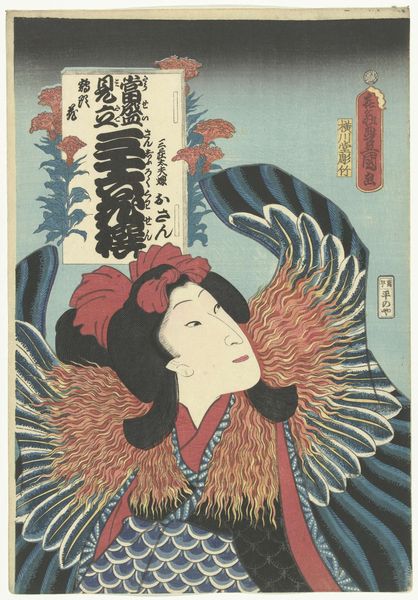 This woodblock print, "Hinadori en perzikbloesem," was created by Utagawa Kunisada. The composition immediately draws the eye to the figure who is framed against a serene blue backdrop and adorned with peach blossoms and a decorative headdress. The patterning throughout the image gives a sense of ornate luxury. The print relies heavily on the interplay between figure and ground, with the solid blue emphasizing the patterned kimono and the decorative elements surrounding the woman. Consider the tension between the flat, graphic quality of the print and the illusion of depth created by the figure’s pose and the slight variations in color. Kunisada, working within the Ukiyo-e tradition, skillfully uses line and color to evoke a sense of ephemeral beauty. However, he also uses semiotic signs, such as the peach blossoms, to allude to cultural codes of status and femininity. The print is not merely a record of a beautiful woman; it is an exploration of how visual elements and cultural symbols can communicate complex meanings.