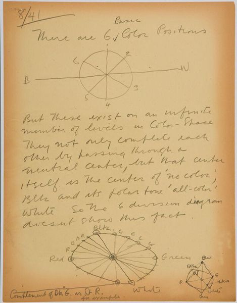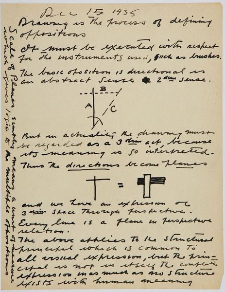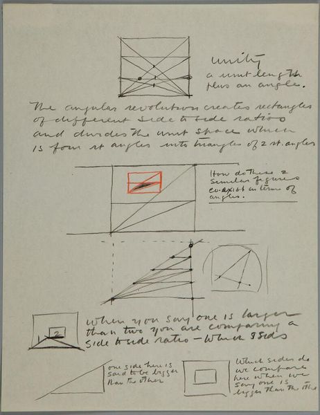 Editor: So, this is "Art Theory Text with Point Relation" by Stuart Davis. It's undated, a little sketch, really. I'm struck by how mathematical it looks, almost like a geometry proof. What's your take on it? Curator: It’s interesting you see it as mathematical. Davis was deeply interested in the relationship between abstract shapes and the urban environment. This sketch reveals a concern with the underlying structures that compose our visual experience. How does the text itself influence your interpretation? Editor: It feels like he's trying to codify his artistic process, make it almost scientific. Is that a common approach for artists? Curator: Many artists throughout history have theorized about their work. Davis, however, was particularly invested in finding a visual language that reflected the fast-paced, modern world. He saw geometry as a way to capture its dynamism. Does this change how you view his work? Editor: It does! I see it as less of an equation and more of a manifesto now. Curator: Precisely, and understanding that socio-historical context really transforms our reading.