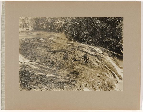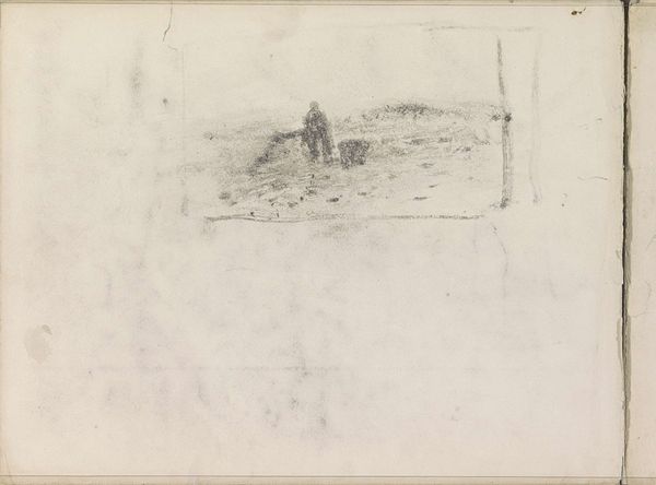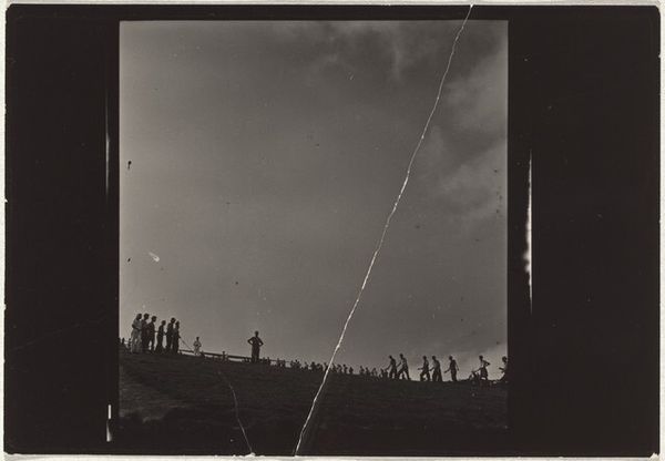 Editor: Here we have Jack Gould's 'Untitled (sheep wandering around on hillside),' a small gelatin silver print. There's a sense of quiet solitude here, a kind of hazy dreamscape. What do you make of it? Curator: It whispers of simpler times, doesn't it? The sheep are like thoughts, wandering aimlessly. It feels intimate, almost a memory. The little pool... I wonder what secrets it holds? What do you suppose the artist was feeling? Editor: Maybe a yearning for that simplicity? Thanks, I’ll keep that in mind! Curator: The pleasure is all mine.
