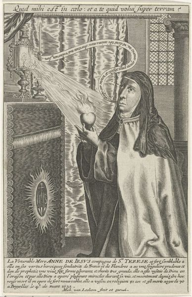 Gilles Rousselet created this print of Saint Scholastica. The composition is structured by the stark contrast between light and shadow, focusing our attention on the saint's contemplative posture. The lines, etched with precision, define the textures of her habit and the surrounding objects, creating a palpable sense of depth within the two-dimensional plane. Notice how Rousselet uses the grid-like structure of the ceiling and floor to create a sense of order. This formal arrangement supports the subject's devotion. Yet, the ethereal light enveloping the cross and dove introduces a dynamic tension. The cross and dove seem to disrupt this sense of structured reality. The etching becomes a semiotic system, a series of signs pointing to spiritual contemplation. The material qualities—the stark lines and contrasting tones—are not merely aesthetic choices. They function as integral components of a visual language that invites us to consider the relationship between the earthly and the divine, and the structures that contain them.