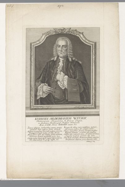 Curator: This print, “Portret van Carel Wouter Visscher”, realized by Reinier Vinkeles between 1786 and 1809, shows its subject in front of what seems like a full arrangement of props: the man's depicted in frame sitting on top of a bigger pedestal, featuring a place for writing a name and being surrounded by books. Editor: Oh, that's fascinating. The initial feeling I get is one of constructed authority. Like, here's a man carefully posed within layers of symbols designed to communicate importance, knowledge, and probably prosperity. Curator: Precisely. Vinkeles' engraving makes incredible use of Neoclassical elements here; everything from the architectural framing to the restrained color palette lends it a air of gravitas and ordered calm. Note also how he's presenting his knowledge in front of open books: This whole work emphasizes enlightenment thinking. Editor: The books are definitely speaking volumes—literally and figuratively. It’s as if the engraver wants us to know Visscher wasn't just a pretty face; he was a scholar, a thinker, deeply rooted in intellectual tradition. The inclusion of the quill on the pedestal really seals that idea! Curator: Yes! And let’s consider Visscher's expression; somewhat impassive, perhaps even a bit severe. It reinforces the idea of rational thought and the dominance of reason, which was typical during the rise of neoclassicism. Also look to the clothes depicted: There is nothing screaming opulence! It's pretty plain overall. Editor: His look seems somewhat plain and modest to my eye, fitting nicely into that image of restrained respectability that was appreciated at that time. Funny how much "saying nothing" becomes the loudest statement. Curator: Exactly. The lack of excess and plain dressing says even more in a context like this: a silent claim to virtue. The print serves as a lens into late 18th century society and values of that specific point in time! Editor: Thinking about the print in our present context makes me wonder, how do we build our own visual symbols of authority now, with completely different materials and social ideals. Curator: An important and relevant question to be raised in connection to such artwork, I agree! One which highlights the temporal aspect to symbols: We might want to change them according to different societal standards and the passing of time!