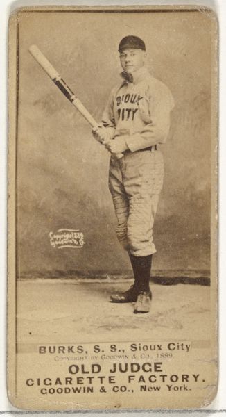 Curator: This is "Owen Joseph Patton, Right Field, Minneapolis," a photographic print from the Old Judge series, created around 1888 by Goodwin & Company. Editor: It's instantly captivating. There's a sense of both strength and melancholy in his stance, a solitary figure caught mid-motion, like a fleeting memory. And the sepia tone lends a real feeling of antiquity. Curator: The image speaks to a burgeoning culture of celebrity, driven by the rise of mass media. Patton, here, transcends merely being a baseball player; he becomes a commodity, linked inextricably with "Old Judge" cigarettes. Editor: Indeed, cigarette cards often depicted ideals of manhood and strength in that era. Note how the oval shape mirrors classic cameo portraits of nobility or renowned citizens. But in his uniform, Patton democratizes this historical form. The Minneapolis script across his chest is almost a heraldic crest. Curator: Yes, the iconography is compelling. Baseball was becoming America's pastime, and these portraits captured its heroes. However, the racial dynamics of the sport and society at the time need consideration; such platforms often excluded many. Editor: It makes me reflect on what these cards represented to early baseball fans, like tangible symbols of their connection to the sport, of a shared American experience. Curator: Absolutely. His expression, gazing off into the distance, hints at broader socio-economic anxieties and dreams intertwined with the rise of spectator sports. This photo serves as a tiny window onto the cultural and economic transformations underway in late 19th century America. Editor: Ultimately, seeing his determined, yet melancholic gaze, it resonates still. His gesture is of giving; something timelessly human remains even behind all of the branding, fame and commodification. Curator: A profound reminder that objects carry complex stories of ambition, access, and identity that remain relevant for our continued understanding.