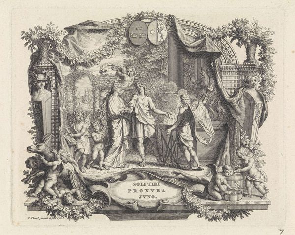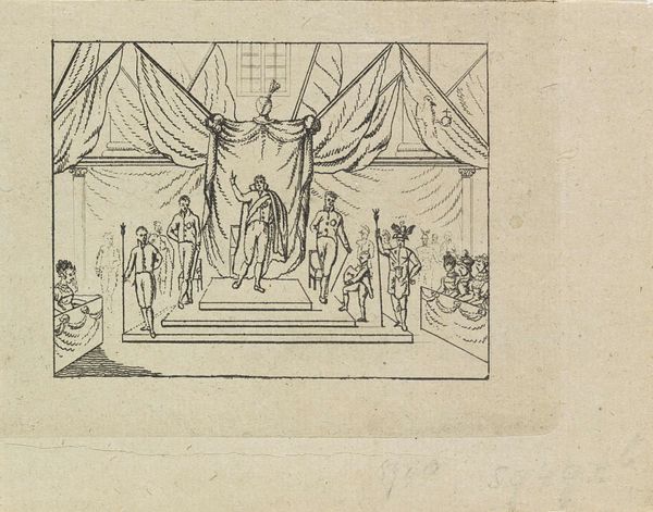 Curator: Materially speaking, this engraving, “Kist in een kerkinterieur” from 1592 by Frans Hogenberg, really puts labor on display. It reminds us that images, even then, weren’t just magically appearing – skilled hands and resources shaped them. Editor: This piece is fascinating; there's so much detail, considering the print medium. It has a very solemn mood, but also there’s a clear emphasis on civic display through those armorial banners. What strikes you most about it? Curator: What's significant to me are the means of production it suggests. The engraving process, the ink, the paper - these elements situate the image within a specific social context. How was the paper sourced? Who mixed the ink, and from what materials? What socio-economic class did the engraver come from? These were trade skills learned via apprenticeship, weren't they? This wasn't necessarily considered “high art.” Editor: I hadn’t thought of it that way. I guess I was too focused on the heraldry and the scene. Are you saying it blurs the lines between art and craft because its production involves a trade? Curator: Precisely! The very act of creating multiple prints suggests wider distribution, appealing perhaps to a broader, possibly less elite, consumer base. Look at the clothing of the figures in the engraving—what does it tell us about social status and the textile trade of the era? Even the choice of subject matter – a civic ceremony– aligns with a materialist perspective; Hogenberg’s print becomes a commodity within a larger network of exchange. What kind of consumption, and by whom, was he facilitating? Editor: So it's not just the image itself, but the entire production process and its place within the economy of the time. Curator: Exactly. By interrogating the materiality of the print, we gain insight into 16th-century labor, consumption, and the complex relationship between art, craft, and social status. Editor: I learned to not just look *at* the art, but also *through* it, understanding all its components, labor, and materials in historical context.