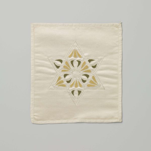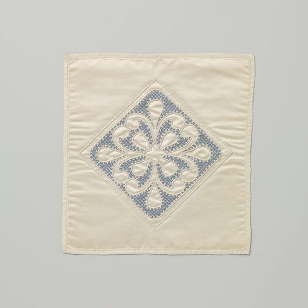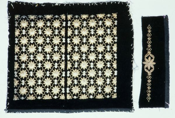 Curator: What catches my eye immediately is this beautifully executed textile work. Entitled "Handwerk met Jugendstilmotieven", it dates back to around 1900 and, remarkably, features design work from the hand of Aagje Tiket. The Jugendstil motifs really do define it, don't you think? Editor: It has an almost unsettling order, a rigorous geometry clashing with the soft textures. The color palette feels restrained and I almost find it cold; how did such precise labor emerge from something called ‘Handwerk’? Curator: Well, "Handwerk" in this case directs our focus. Consider how design reform movements advocated elevating craft to fine art status, challenging the dominance of industrial production. Tiket and her peers aimed to inject artistry into everyday life and make it accessible to more people through these handicrafts. Editor: Absolutely, there’s this tension in it that feels indicative of the contradictions within that impulse. I see the appeal to make beauty part of life for more people, but who really had the access, resources, or even the leisure to create these pieces? Who was this art really for? Curator: Fair point. Examining exhibition records or workshop attendees might illuminate whether Tiket specifically engaged working-class women. We can also note, however, that even aspiration to such democratization shifts artistic focus towards social reform at the time. Editor: I am especially drawn to the stark black backdrop juxtaposed against the creamy leaves, lending a peculiar intensity to the geometric and organic pattern, it reflects a sentiment of nature idealized through this ordered eye. It makes me think of silent textile mills operating at a huge scale with female work force within a society structured along gender and class hierarchies at the time, too. Curator: Yes, the symbolism—these stylized leaves arranged within such structured framing, speaks to the Art Nouveau desire to incorporate the natural world into the industrial world. What stories could those stitches tell! Editor: Absolutely. Analyzing this piece allows us not just to appreciate it aesthetically but also to examine the complex dialogues about craft, labor, and societal reform present during its era. It definitely has sparked in me, ideas that deserve deeper reflection. Curator: Indeed. Seeing these crafted works contextualizes historical socio-economic trends—how the arts integrate or contest with forces reshaping social realities. Examining them through that lens broadens art historical discourse.
