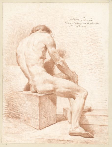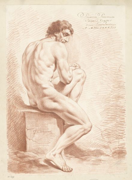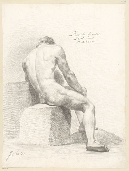 This drawing, "Zittend mannelijk naakt, op de rug gezien" or "Seated Male Nude, Seen from the Back," was made by A. Waterloo using graphite on paper. Look closely and you will see the artist's control of the medium. Waterloo coaxes a range of tonal values from the graphite, creating shadows, highlights, and detailed textures. Graphite is a relatively common material, and drawing is often considered preliminary, a preparation for painting. But in this case, the draftsmanship takes center stage. The materiality of the graphite, smooth and precise, emphasizes the muscularity of the figure and the rough texture of the stone. The use of hatching and cross-hatching techniques demonstrates the artist's mastery, as it creates depth and volume with simple lines. By focusing on the process and materiality of the drawing, we can appreciate the work as a skilled exploration of form and texture. This challenges traditional notions of art that prioritize only the subject, not the craft.
