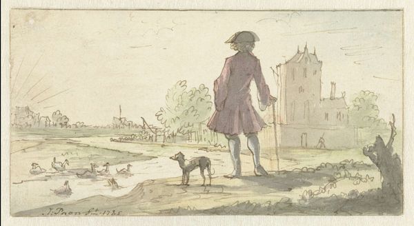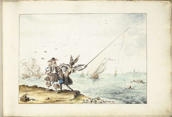 Gesina ter Borch made this watercolor and pen artwork, titled "Moses ter Borch aan de Engelse kust," as part of her family album. Gesina, unmarried, lived in a time when women’s creativity was often confined to domestic settings, yet she found ways to express her artistic voice. Here, her brother Moses stands elegantly dressed on the English coast, against a backdrop of naval ships. This is juxtaposed with the skeletal figures of death both in the sea and the landscape, creating a stark commentary on the ever-present dangers of maritime life and warfare. Moses was a marine officer, but also an artist. Gesina's depiction of him is poignant, as he would later die at sea. The underlying tension between the glorification of military service and the grim reality of death at sea is striking. What does it mean to remember someone through the lens of both admiration and sorrow, and to situate that personal grief within a broader narrative of national pride and military conflict?