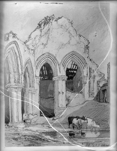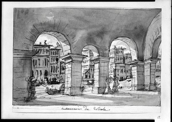 Curator: Germaine Rouget Cheruy's "Vezelay, La Madeleine, the Nave," presents an interior view, rendered in what appears to be delicate watercolor washes. Editor: The immediate impression is one of immense scale and contemplative quiet, despite the figures populating the space. Curator: Note how Cheruy uses stark contrasts to define the architectural elements—the robust columns, the soaring arches. The light seems almost to sculpt the space. Editor: Right, and this nave served as a major site of pilgrimage during the medieval crusades; these gatherings of people, even depicted so subtly, were historically spaces of political and religious organization for centuries. Curator: The restrained palette focuses our attention on the interplay of light and shadow, emphasizing the geometric structure of the Romanesque architecture. Editor: It's fascinating to consider how this echoes earlier artistic depictions of the same spaces but from a more contemporary, post-religious perspective. Curator: Indeed, the formal properties allow for a timeless reading of space and light. Editor: It leaves me to ponder the enduring role of architecture as both setting and silent witness to history's unfolding narratives.