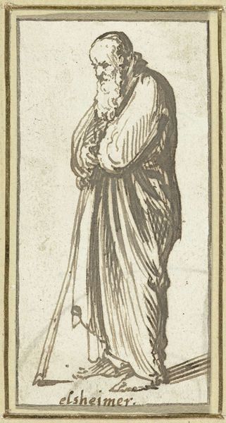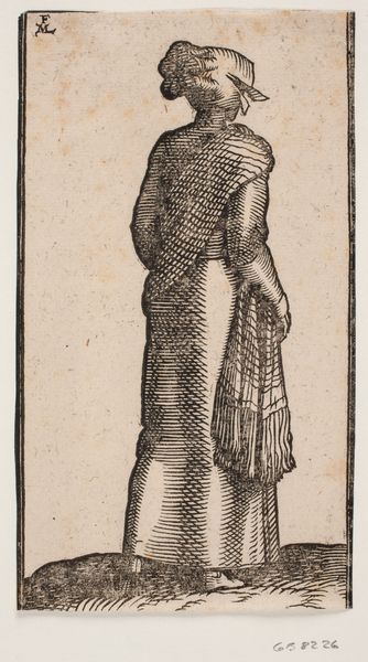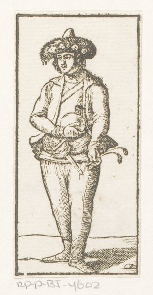 Editor: Here we have an etching from the 17th century titled "Standing Man with a Hat and a Moustache" by an anonymous artist. The fine lines of the engraving give the figure a surprising amount of dimension. What do you see in this work? Curator: Observe the composition itself. The figure is presented frontally, filling the pictorial space, and confined by the geometric boundary. This choice emphasizes the figure’s form. Do you notice how the artist utilized hatching to articulate the fall of light? Editor: I see it! It gives a sense of volume, especially on his robes, and the slight shadow around his feet grounds him. Is there significance to the placement of light and dark areas? Curator: Precisely. Notice also the artist’s economy of line; each stroke is deliberate, contributing to both contour and texture. Semiotically, the textures of his attire can convey meaning without having to rely on color or hue, especially given the limitations of the medium. Editor: I hadn't thought about the restrictions of the medium. The artist had to be really precise. The patterns created by the overlapping lines are mesmerizing. Are you drawn to specific aspects of this figure? Curator: The arrangement of folds, falling down the body—it guides the viewer's eye in a complex reading of planar shifts in a way only line work could produce, given it is rendered as pure surface, but our depth perception fills in where pigment is not afforded. Editor: Thinking about art in terms of surfaces and folds definitely adds another layer to the way I observe the artist's choices! Thanks for opening my eyes. Curator: You're most welcome. A keen observation of the artist’s formal choices reveals more than any historical account might convey.