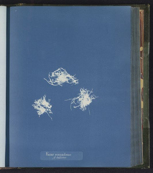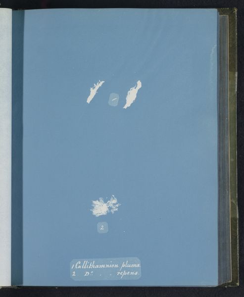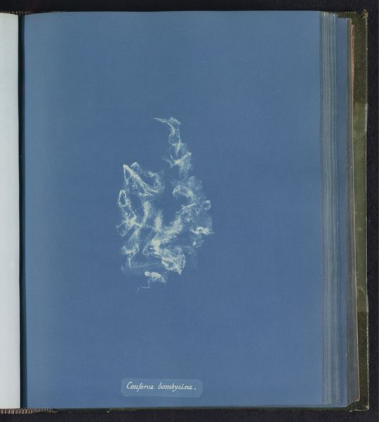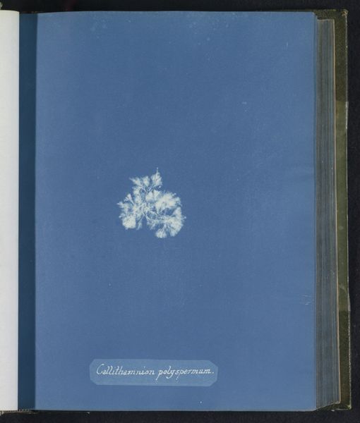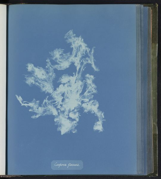 Editor: Here we have Anna Atkins' "Callithamnion purpurascens," made sometime between 1843 and 1853. It’s a cyanotype, so an early form of photography using a photosensitive printing process, resulting in this striking, almost ethereal blue and white image. The ghostly forms of the seaweed float on the page. How would you interpret this work from a formalist perspective? Curator: The first aspect that seizes my attention is the arrangement. Note how Atkins positions these delicate fronds against the monochrome ground. The distribution is quite interesting, eschewing a balanced or symmetrical format for an almost scattered, random placement. It defies any pre-conceived notion of botanical illustration from that period. What compositional elements strike you? Editor: I’m drawn to the contrast, how the whiteness of the plant, more of an impression of a plant actually, really pops against the blue. Curator: Precisely. This stark contrast defines the visual experience, a tension, a play between positive and negative space. The cyanotype process lends itself to abstraction here. Consider the lines—how they capture the texture of the seaweed without rendering it in explicit detail. We must also acknowledge the monochrome, removing color distractors to underscore form. Do you find that significant? Editor: Absolutely, that makes me notice that the details aren't what matter most here. Curator: Right. It’s the formal arrangement of light and shadow that dictates meaning. Ultimately, we are left contemplating the essence of form through its photographic trace. I concede, one might even question if the actual subject, the seaweed, matters so much as the photographic process and composition here. Editor: It’s interesting how focusing on the formal elements elevates a scientific record to an artistic composition. Thank you. Curator: Indeed. A close reading of the visual language offers a deeper engagement with the artwork.