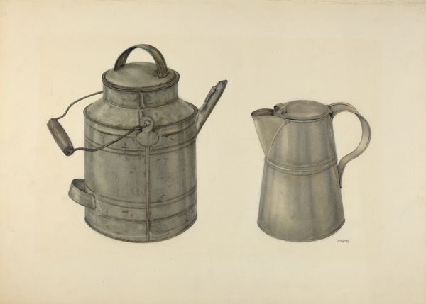 Editor: Here we have Edward Loper's "Milk Warmer," from around 1939, using watercolor, charcoal, and pencil. It’s quite a humble subject, isn't it? Almost mundane. What strikes you most about this work? Curator: Its ordinariness, paradoxically, becomes quite compelling when we consider the social and political landscape of the late 1930s. The Great Depression was still a lived reality for many, particularly for African Americans, for whom economic recovery lagged significantly. A utilitarian object like this speaks volumes about resourcefulness and making do. What do you make of that? Editor: That makes sense. The slight rust and wear also suggest a history of use, not wastefulness. Does that relate to how we see realism as a style? Curator: Precisely. Realism here isn't just about representing the object accurately. It becomes a quiet form of social commentary. Loper, as an African American artist working during a period of intense racial segregation and economic hardship, might be subtly highlighting the dignity of everyday labor and domestic life. How might ideas of race and labor intersect in this drawing? Editor: Well, owning and maintaining this milk warmer may reflect an act of resistance in the face of economic constraints, almost a celebration of domestic independence in a difficult social climate. Curator: Indeed. It prompts us to consider who had access to such a device and the stories embedded within its existence. How can the simple act of depicting it become political? Editor: By reminding us of those whose stories are often overlooked. I originally just saw a worn milk warmer but it speaks of the context of a specific period of US history, seen from the perspective of labor and domestic spaces!