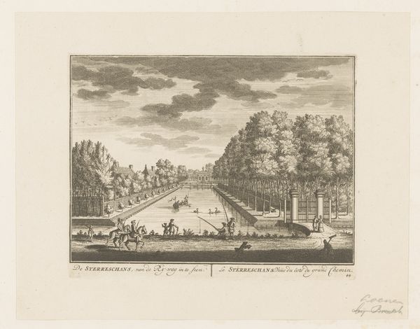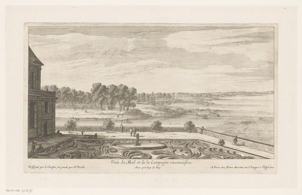Curator: Let's turn our attention to a fascinating print held here at the Rijksmuseum, “Menagerie op Paleis Honselaarsdijk," likely created between 1696 and 1774 by Cornelis Danckerts II. Editor: It's captivating. The etching and engraving work beautifully together to give this landscape such incredible depth and almost photographic detail. It reminds me a bit of a stage setting with all its receding planes. Curator: Indeed. Danckerts has captured not only the architecture and meticulously manicured gardens, but also a snapshot of Dutch Golden Age aristocratic life. The menagerie at Honselaarsdijk Palace was famed, and images like this offered a glimpse into a privileged world. Think about the implications of that visual accessibility. Editor: And what striking formality! See how the architectonics are rigidly ordered with geometric exactitude which juxtapose nicely to all the wild activity amongst the exotic birds in the enclosure. And look at the perfectly balanced landscaping. It’s so very controlled and refined. Curator: Precisely. It represents the Dutch elite’s aspirations to possess, control, and display nature—and therefore their wealth and status. Genre painting during this period offered moral messages regarding such displays of power. I see a comment here on the controlled versus uncontrolled. The politics of imagery, even in leisure scenes, spoke volumes about social structures and values. Editor: That tension is really palpable and expertly expressed through contrasts within the pictorial space, not just visually, but symbolically as well! All that meticulously placed detail guides your eye exactly where the artist wants it to go. The feathery details achieved with such precise hatching are truly remarkable. Curator: Well, it's an insightful depiction of a very specific moment in Dutch history, reflective of the cultural values around the role of art and class hierarchy in that Golden Age society. Editor: And a brilliant study in contrasting textures and the possibilities afforded through careful printmaking. Each viewing yields something more.