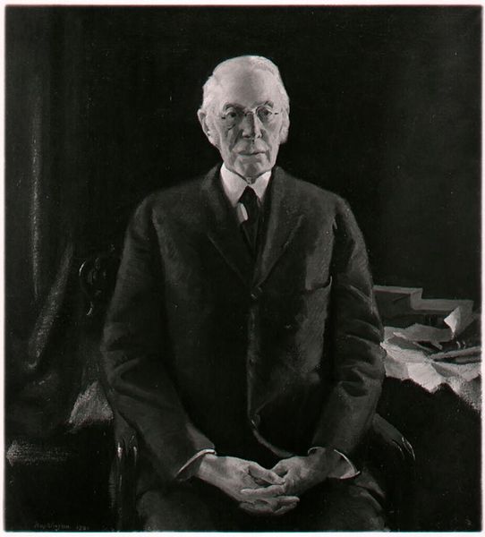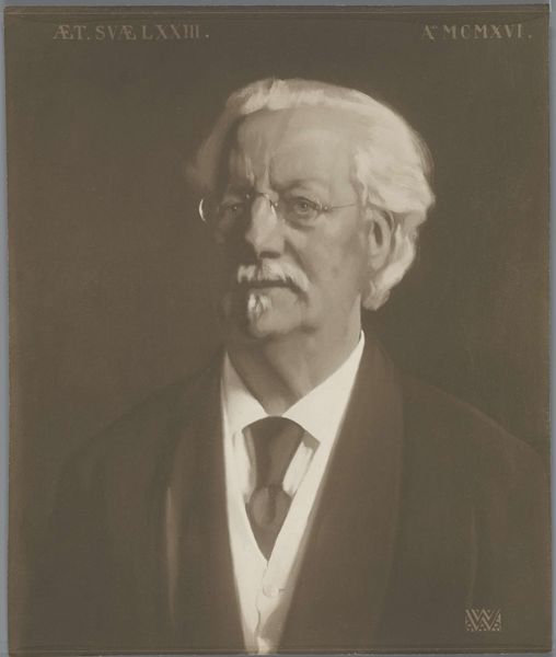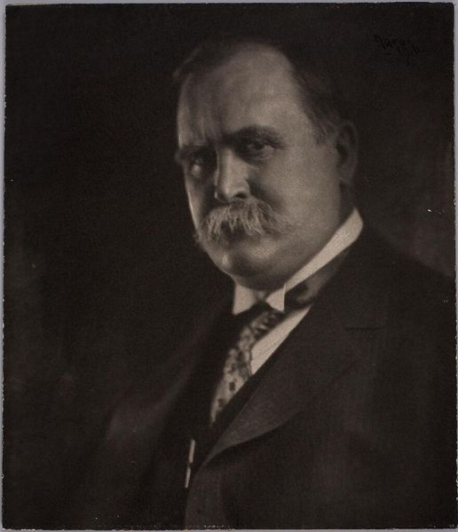 Editor: Here we have John Garo's portrait of George Ellis. It's a gelatin silver print, roughly 43 by 35 centimeters. I'm immediately drawn to the stark contrast. What can you tell me about the process of making this? Curator: The gelatin silver process is key. Its reproducibility democratized portraiture. Garo's choice reflects a shift from unique, handcrafted images to mass-produced ones, impacting how we value labor and photographic truth. Editor: So, you're saying the material changes the meaning? Curator: Absolutely. Silver gelatin prints became ubiquitous, tied to consumer culture and a different social standing than, say, a painted miniature. Editor: That’s fascinating. I’ll definitely look at photographic materials differently now. Curator: Indeed. Understanding the 'how' informs the 'why'.