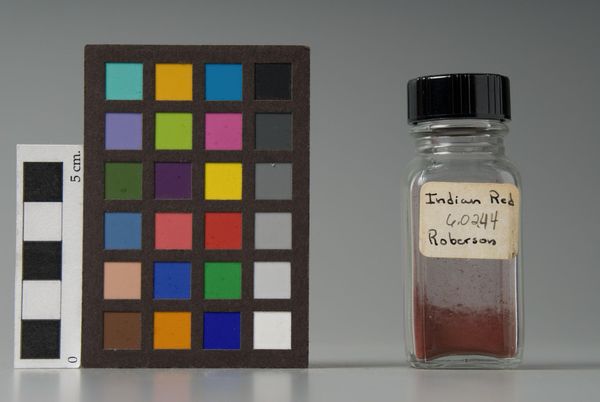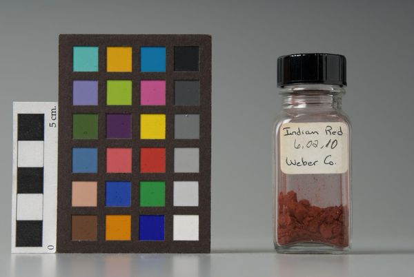 Editor: Here we have a jar of "Indian Red" pigment manufactured by Winsor & Newton. I'm struck by the presence of the color chart. What stories do you think it tells? Curator: Well, the color chart and the pigment jar invite us to consider the standardization and commodification of color in art. Winsor & Newton, as a company, played a crucial role in shaping artists' palettes and, by extension, the visual landscape of art itself. Editor: So, the "Indian Red" isn't just a color, but a product of a particular system? Curator: Precisely. It's marketed under a specific name, packaged, and sold. The jar and the chart together prompt us to reflect on how commercial interests and industrial processes influence artistic creation. How do you think that knowledge might shape an artist's choices, considering that? Editor: That’s a perspective I hadn’t considered before! It makes me think about where the color comes from.