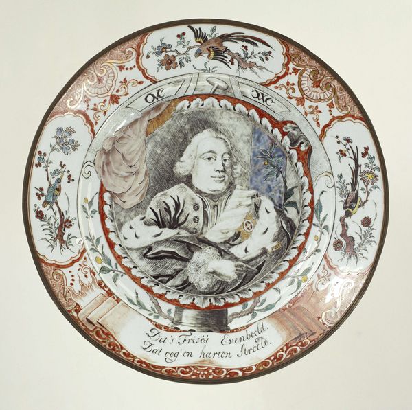 Curator: Good morning. We’re looking at an object held in the Rijksmuseum’s collection: a plaque showcasing a portrait of Antoni van Leeuwenhoek, likely created between 1725 and 1750 by an anonymous artist. It’s rendered in blue and white ceramic, giving it the feel of Delftware. Editor: My first thought is that this image is both stately and somehow very intimate. The monochrome palette gives it a serene, almost dreamy quality. There's something touchingly earnest about the rendering of Leeuwenhoek himself. Curator: It’s a compelling portrayal, certainly. Blue Delftware often evokes a sense of Dutch identity and pride. Beyond the decorative appeal, there is an explicit association of place and person. The portrait becomes an enduring memento. Editor: The detail of the instruments and notations around him—they are almost devotional objects within his workspace. I can nearly hear him, a private alchemist revealing life’s mysteries in miniature. Curator: That's beautifully put! The imagery of his scientific practice definitely adds layers. This era valued empirical observation, yet there's also this intense, almost solitary pursuit of knowledge suggested by the setting. He’s both scholar and solitary hero of discovery. Editor: Do you think there is a correlation to be found between rendering his work in ceramics? Stoneware or ceramic in some instances speaks of both utilitarianism and permanence, that desire to take fleeting life and render it visible… immortal almost? Curator: That’s an insightful observation! There is, indeed, an element of enshrining Van Leeuwenhoek, celebrating a very mortal man whose work transcended the immediate. In this context, the choice of ceramic is rather clever and certainly deliberate. Editor: Considering the visual choices surrounding Leeuwenhoek and what those images convey... I feel a poignant tension between discovery and fragility in the plaque's design, a testament to both the power and impermanence of understanding. Curator: Ultimately, I think the plaque honors his lasting contribution. It becomes this lovely tribute, an intriguing window into the age of early scientific pursuit.