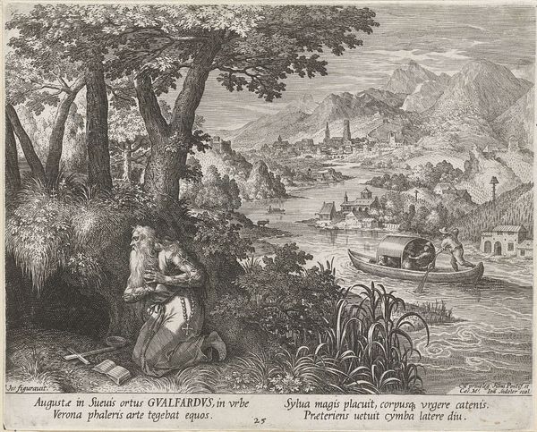Editor: We’re looking at "Rivierlandschap met het embleem over een ongelijk paar belaagd door Cupido en de Dood" – or, "River Landscape with the Emblem of an Unequal Couple Besieged by Cupid and Death" – an engraving made between 1595 and 1600 by Johann Sadeler I. It's currently held at the Rijksmuseum. The scene, rendered entirely in monochrome lines, feels strangely… ominous despite the idyllic river setting. What do you see when you look at this piece? Curator: Well, my dear, this isn't just a landscape; it’s a memento mori dressed up as a pastoral scene. Sadeler is slyly reminding us that love and death are the only two guarantees in life, rather like a slightly morbid party trick. That cupid up there, haphazardly aiming his arrow? He’s matched by a skeletal figure lurking in the shadows, and the lovers seem blissfully unaware. Almost comical, isn't it? But look closely – the detail, the intricate rendering of the leaves and the water. Notice how death isn't hidden, just slightly out of focus, and ready to strike anytime, while life flourishes, even in its surrounding, ready to protect our enamored couple. Do you notice that sense of constant tension and surprise? Editor: I do now that you mention it! It is kind of funny, actually, seeing Death lurking there, bow drawn, while this couple is completely absorbed in each other. Curator: Exactly! Sadeler is commenting on the fleeting nature of pleasure, love, and beauty, while hinting to what can occur without warning: death and pain, represented as a skeleton archer ready to shot from the shadows. The real genius lies in the composition – the dense forest juxtaposed against the open landscape, life and joy that exist while still ready to vanish. The engraving allows for a wide array of expression through lines, as though he wants to provide the means, through shadows, to express joy and gloom. A very impressive work of balance! Editor: I hadn’t really noticed the contrasts before. I was too focused on the figures. Thanks, that definitely changed how I see it. Curator: Anytime! Remember to always look for the light AND the shadows; without them, the engraving wouldn’t convey that complex story. Now go forth, and contemplate mortality and questionable love choices!