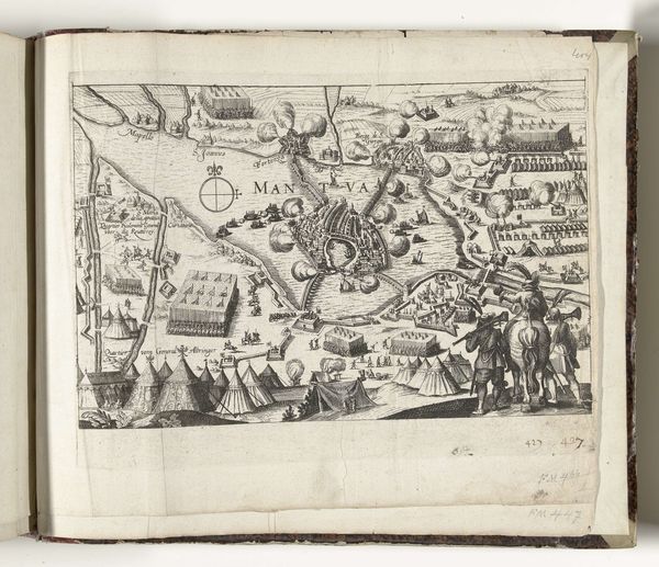 Editor: Here we have a print entitled "Plan van La Rochelle en omgeving, 1627" from around 1627-1629, attributed to Frans Hogenberg and held at the Rijksmuseum. It's a fascinating engraving. It gives off such a sense of contained tension, with the walled city and encircling fortifications. What catches your eye in terms of its visual structure? Curator: It's indeed compelling. The formal qualities immediately suggest the concerns of the engraver. Note the deliberate geometricity; the radial symmetry of the fortifications, how they stand against the natural undulation of the terrain. Observe, also, the careful rendering of line weight. Do you see how varied widths are deployed to create depth and shadow, particularly within the city itself? Editor: Yes, the line work is incredibly detailed. It seems like he really wanted to define those structures, and make sure we recognize La Rochelle as its own, confined shape, encircled by walls. The ships seem poised, too. Curator: Precisely. The balance between detail and abstraction serves to emphasize the relationship of the built and unbuilt environment. This deliberate tension reflects the contemporary understanding of man's interaction with nature through strategic interventions in the landscape. Hogenberg employs line, form, and the calculated distribution of space to illustrate the push and pull of power and geographic constraint. What kind of rhythm can you feel across its forms? Editor: Hmm, well the rhythm feels a bit halted; the barricades feel intentionally disrupting. This reminds me of mapping, and what cartographers prioritize, when creating a sense of political or spatial boundaries. Curator: Exactly! The work emphasizes a kind of objective record of a historically fraught space. Did you also consider the use of perspective? It's a high, almost god-like viewpoint, isn't it? This enhances our understanding by offering comprehensive visual data on geographic realities and human impositions. Editor: I hadn't thought of it like that, seeing the viewpoint as a kind of visual fact. Curator: Indeed. And that’s why engaging with its formal architecture opens pathways to comprehend its intended functions as more than simply illustrative. Thank you.