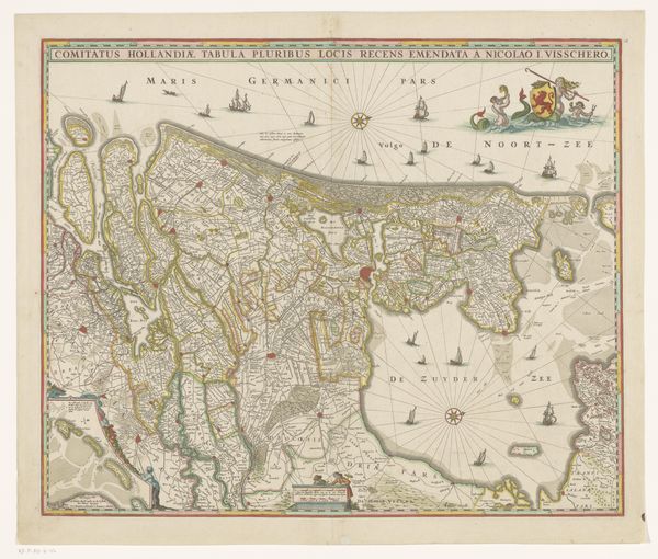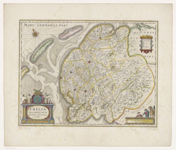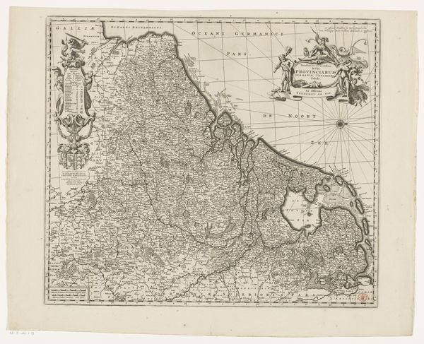 Editor: Here we have a print titled "Kaart van Japan," or "Map of Japan," dating back to around 1658, crafted through etching and engraving by Johannes Janssonius. What immediately strikes me is the sheer ambition of trying to capture a whole country and its surrounding seas, knowing the limitations they faced back then. It feels almost dreamlike, doesn't it? What do you see when you look at this piece? Curator: Dreamlike is the perfect word, I think. It's less a photograph, and more of a painted memory, or even a projection of European desire. Look at the ornate details embellishing the edges, that title cartouche with the figures – it's a performance, really. You have this very specific lens, of a Dutch Golden Age cartographer, encountering Japan, at a moment when encounters were still fraught and filled with speculation. Can you imagine what it must have felt like to hold this map, dreaming of a far away and mysterious land? Editor: That sense of dreaming about a far-off place makes perfect sense, given the context. Do you think the inaccuracies – compared to modern maps – add to that feeling? Curator: Absolutely! The wonky coastline, the strangely shaped islands… it all reinforces that this isn’t about geographic precision. It's about constructing an idea of Japan, filtering it through European eyes. Think about the cultural exchange – or lack thereof! What did the intended audience glean from such an artifact? And what was *lost* in translation, literally and figuratively? Editor: I never thought about it quite like that. I was so focused on judging its accuracy; it’s really more about imagination and cultural perspective, isn't it? Curator: Precisely! We learn less about 17th century Japan perhaps, and much more about 17th century Europe, which in itself is an interesting reflection. I will keep it in my memory!
