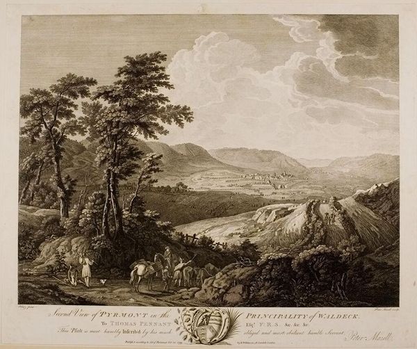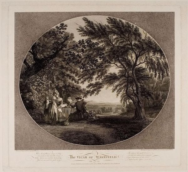 Editor: Samuel Middiman's "Tempest, Act I" presents this theatrical scene within a circular frame. The figures almost seem to emerge from the landscape, a dramatic interaction between humans and nature. What's significant about depicting this particular moment from Shakespeare’s play? Curator: Well, this piece highlights the growing appreciation for Shakespeare in the late 18th century, fueled by a desire for national identity. The print makes this play accessible to a wider audience through visual media, further cementing its cultural relevance. Observe how the scene's composition reinforces the ideals of the sublime, nature dominating humanity. Editor: So, the image isn’t just about the play itself, but also about how society valued art and literature? Curator: Precisely! It reflects how institutions like theaters and print shops shaped the public’s understanding and consumption of culture. Notice too how the rocky landscape reflects the societal anxieties and fascination with the untamed. Editor: I didn't consider the broader context beyond just the image. Thanks for shedding light on that. Curator: Indeed. Looking at art through a social and historical lens reveals so much about the values of its time.