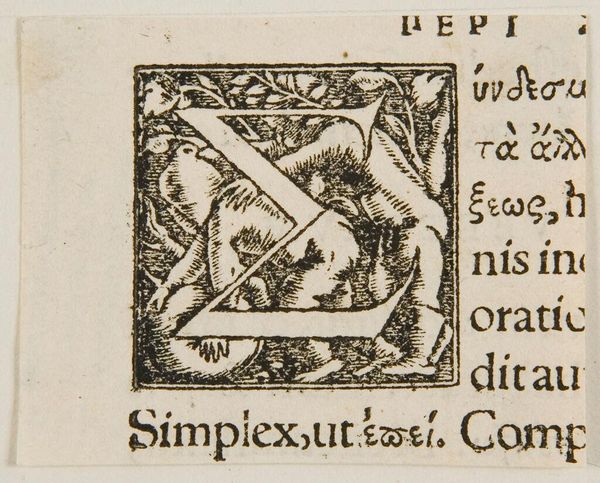 Editor: This little woodcut, called "Greek Letter Pi," is an initial from a much larger text, and it's attributed to an anonymous artist. It's so intricate! It feels like a tiny stage. What do you make of it? Curator: A stage, yes! For me, it's like a portal. The crisp lines and swirling foliage invite you into a miniature world, don't they? It's a bit like looking into someone's imagination... or maybe a glimpse of a forgotten myth? Editor: A portal to a forgotten myth. I love that idea! Curator: It makes you wonder, what story does this "Pi" begin? What worlds lie hidden in those ancient texts? Editor: I never thought a letter could be so evocative. Curator: Exactly! It shows us how much expression and art can be embedded even in the most humble places.
