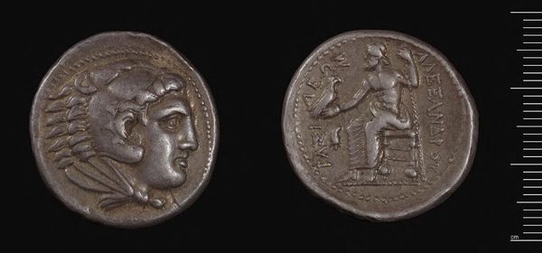 Curator: Here we have a tetradrachm of Alexander the Great, likely minted in Tarsos. Its 17.2 grams of silver belie the weight of its history. Editor: It's incredible how such a tiny object conveys such a sense of power, even millennia later. The relief is remarkably well-preserved. Curator: Indeed. The obverse displays a forceful depiction of Heracles, though many interpret this as Alexander himself adopting the hero's guise. Notice the depth and complexity of the drapery around the neck. Editor: The reverse shows Zeus seated on a throne, holding an eagle, standard symbols of authority and divine approval in the Greek world. It's a clear message of legitimacy. Curator: Quite. But it's the material itself, the cool, enduring silver, that speaks to its function as both currency and propaganda. The die engraver's mastery is evident in the crisp, clean lines. Editor: It's more than just an economic tool; it’s a portable monument to Alexander’s ambition. Curator: A tangible symbol of an empire built on conquest and maintained through powerful imagery. Editor: Seeing these symbols gives us a palpable connection to the hopes and fears of an era long past.