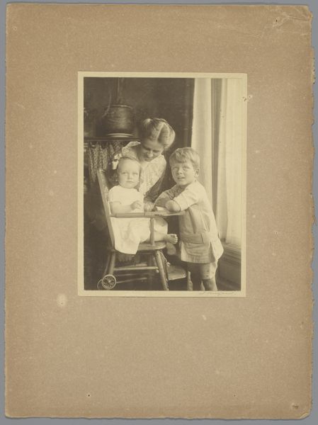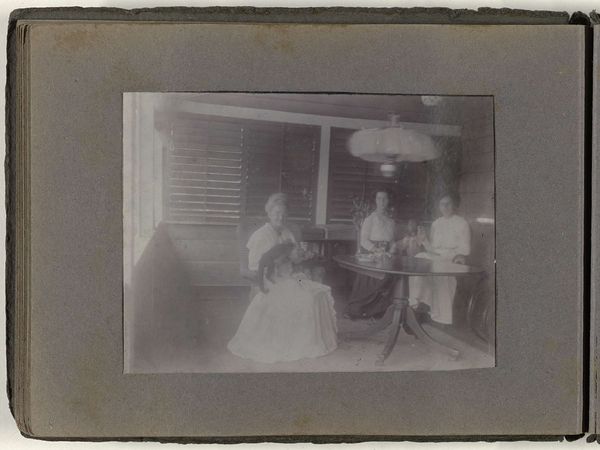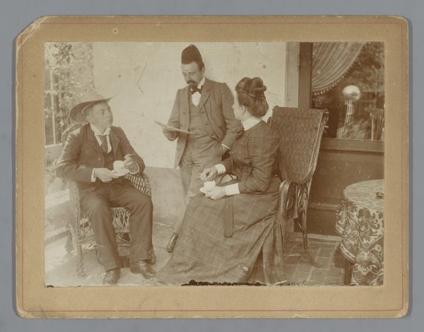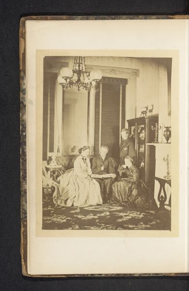 Curator: Let’s discuss "Drie mannen en een vrouw," an albumen print at the Rijksmuseum, crafted somewhere between 1900 and 1922 by Robert Julius Boers. My initial reaction is to the rigid, formal composition. Editor: It definitely projects a certain stateliness. The subjects are positioned formally, seated, with minimal interaction, fostering a reserved atmosphere that invites more observation than immediate engagement. The lighting appears diffuse, adding to the subdued tone. Curator: And yet, isn’t it striking how the setting overwhelms the sitters? The screen, landscapes, lamps, all compete for attention within what looks to be an orientalist display of captured memories of the colony? Editor: The texture of the patterned textiles draped on the foreground figure provide depth and grounding. The formal framing contrasts strongly against this elaborate domestic staging. It provides insight into cultural performance, in a way that more intimate framing would simply fail to capture. Curator: Absolutely, the clothing acts as a powerful marker of colonial identity, situating them as both present and separate from the environment that threatens to consume them. Are we supposed to focus on the faces, or interpret their relationship to Indonesia via their outfits and this faux Asian interior design? Editor: This is what makes it such an interesting study. It operates through a structured formality, but this is challenged by the details – the shadows and light on faces, and the folds of fabric introduce nuanced, asymmetric features which challenge our gaze. It becomes very difficult to settle. Curator: Looking at this through the lens of history, the photo functions as a self-conscious act of display for colonial administration. They’re both at home and posing in ways that underline colonial authority in very coded, yet undeniably awkward manners. Editor: Indeed. These figures within the photography studio are both performative and documentary in intent. The texture invites our eye to search the faces for an essence. A very delicate staging! Curator: A window into a past where identities were shaped, in no small measure, by staging difference through orientalist iconography, captured in this aged paper's monochrome aesthetic. Editor: Precisely, its somber tonal range really underscores this sense of something studied.